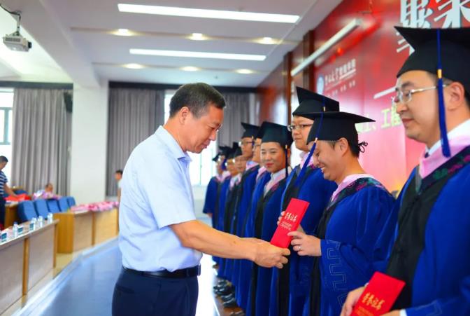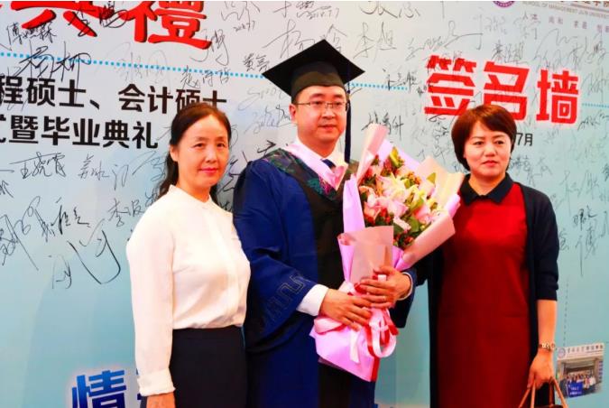典礼进行第三项:经年花开,回忆流年。首先,在制作精美的视频短片中,同学回顾了两年来在管理公司学习与生活的点滴过往和欢声笑语。继而,毕业生代表2016级工商管理硕士马涛发表毕业感言,马涛同学分享了专业学位研究生的“兼得的哲学”,回忆了追求“工作和学习兼得、学习和生活兼得”过程中的收获与成长,对认真给予同学们指导和帮助的导师们表示真切的谢意。接下来,各系主任和系书记作为教师代表为毕业生们送上毕业寄语。老师们鼓励同学们在今后的人生道路上继续奋勇前行,追求卓越,开拓创新,成为商业模式创造者和引领者。老师们的谆谆教诲与殷切期望使员工们再一次感受到师恩如山,怀着深深的敬意,2018届MBA毕业生代表王铁、王柏松为公司献礼,张兴林书记、赵树宽经理代表公司共同接受了这座领航舵,并表示公司必将承载同学们的信任驾风远航。