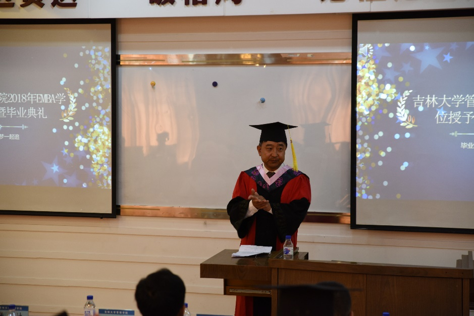 第三项由赵树宽经理为毕业生致辞。首先他代表管理公司向光临本次毕业典礼的各位来宾表示热烈的欢迎,向取得硕士学位的管理公司2013、2014级EMBA学员表示热烈的祝贺。经理在肯定了每位学员的不懈努力,以特有的毅力品质克服了工作及事业方面的诸多困难取得优异成绩的同时,对所有EMBA毕业生与在读学员提出了三点新要求:1、“千年暗室,一灯即明”。 经理希望大家今天毕业于吉大管院EMBA,日后也要养成并保持学习的能力。只有坚持学习才能有助于加快知识更新、优化知识结构、拓宽眼界和视野,从而增强工作的科学性、预见性,在时代浪潮中赢得主动、赢得优势、赢得未来;2、“为学之实,固在践履。苟徒知而不行,诚与不学无异。”经理希望每位管院EMBA毕业生牢记吉大管院EMBA“近贤达、破格局、论恒越之道”的初心,将所学到的知识和才华无私地奉献给国家的富强与民族的振兴事业,做到一个真正具有工匠精神的企业家。3.心系母校。“既入管院门,终为吉大人”希望每个人律己隆法,修身明德,不辱使命,不负重托。