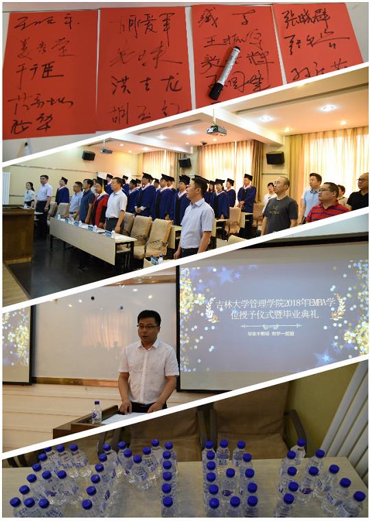 第四项集体观看2013、2014级EMBA毕业短片并由毕业生代表2013级高级管理人员工商管理硕士于广臣、2014级高级管理人员工商管理硕士王振宇致毕业感言。两名学员分别讲述了自己EMBA学习之旅的回忆、感悟与收获,更表达了今后肩负吉大管理人这标签,定将努力做到立足中国,面向世界,心怀天下,经世济民。只愿走出半生,归来仍是管理人。