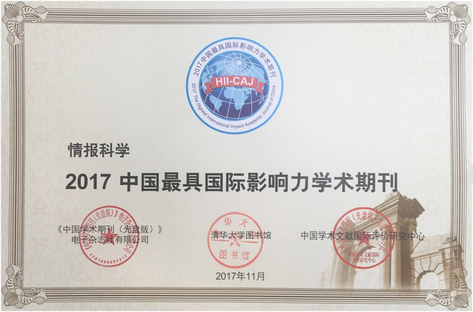 公司《情报科学》获评“2017中国最具国际影响力学术期刊”(人文社会科学),自2013年以来,《情报科学》已连续五年获此殊荣。