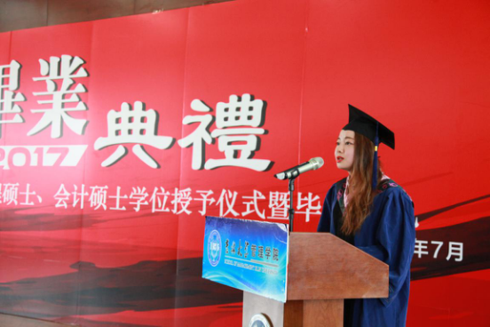 2015级MBA逄博代表毕业生致毕业感言,她表达了对公司、对老师的感恩之情和自己的拼搏进取之心。她表示毕业是一个新的开始,大家要在未来的人生中不断奋斗,为母校增光添彩,为社会多做贡献。