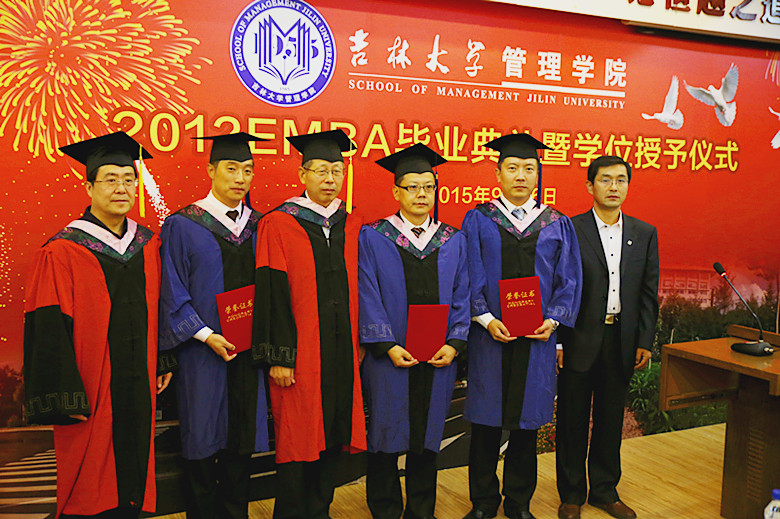 2012EMBA学员郭钰同学代表毕业同学发言,他说:“今天虽然离开了校园,但是我们的心并没有离开吉大。我们还是吉大人,我们还属于这个广阔的舞台。告别校园后 要走的路更长,让我们共勉,用实际行动和工作成绩向母校及公司做出最好的汇报!”