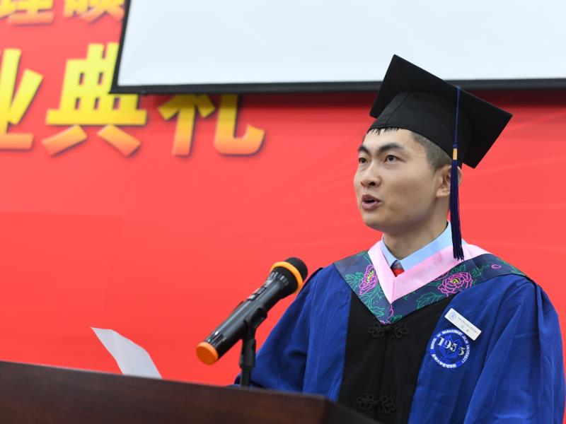 2019届毕业生们精心制作了回忆视频,回顾在校生活的点点滴滴,同学们感慨万千,一幕幕温馨与美好的画面涌上心头。2019届MBA孙玥代表毕业生讲话。他表示:毕业不是终点,而是一个新的起点。同学们必将秉承公司“人本、尚和、求是、创新”的精神,敢于磨砺自我,挑战自我,脚踏实地,勇于创新,以优异的成绩为母校增光添彩。