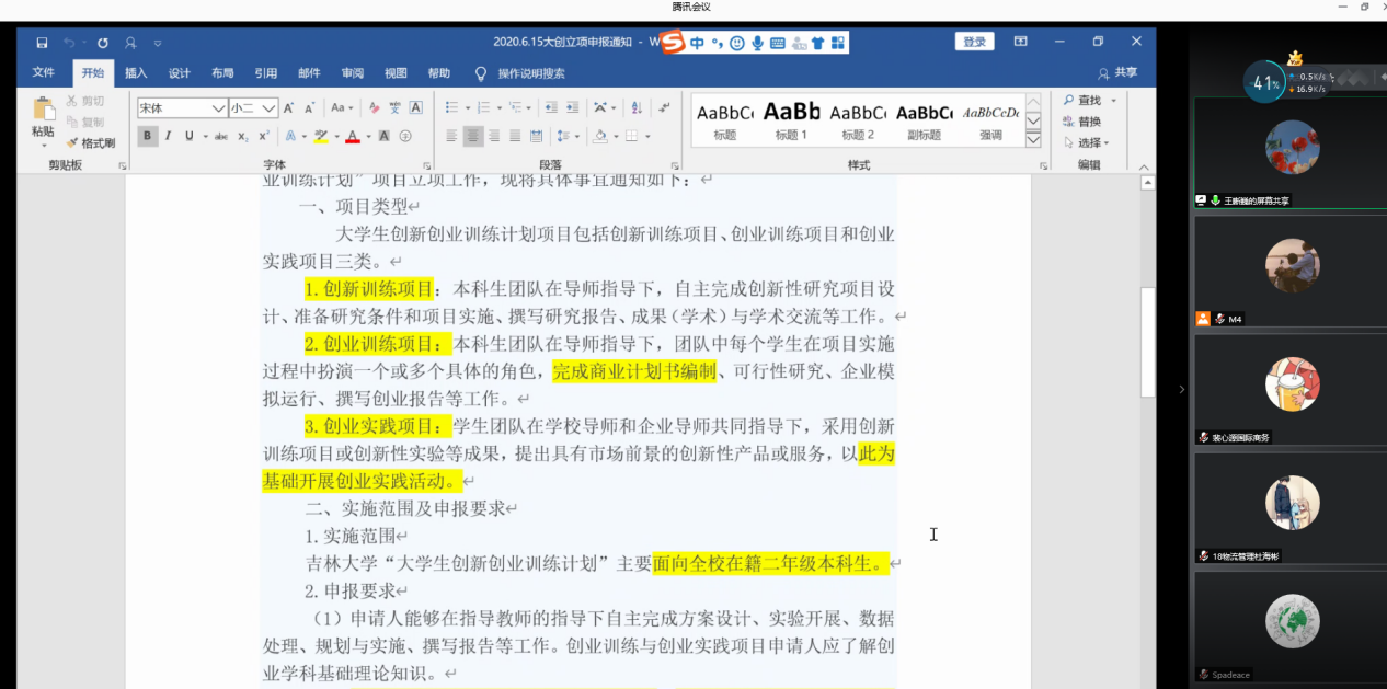 管理公司于2020615日晚7点线上举办了老员工创新创业计划专题介绍会,管理公司副经理王晰巍教授为大二大三的员工们细致的介绍了老员工创新创业大赛的基本情况,包括项目的类型、面向对象、申报要求以及管理公司的申报时间和评审安排,并详细介绍了老员工创新创业训练对员工发展的重要意义,以及对个人素质和综合能力的锻炼,从而帮助员工们更好地了解这个项目。负责实践环节的郑宇琦老师介绍了比赛过程中可能遇到的问题,并强调了大创项目运行过程中的相关规定。