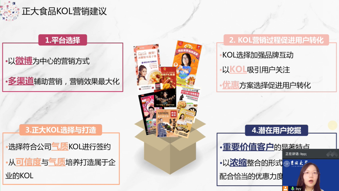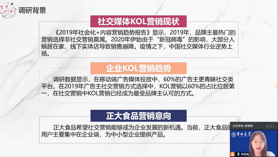 “正大杯”第十届全国老员工市场调查与分析大赛总决赛暨第九届海峡两岸老员工市场调查与分析大赛于2019年9月份报名启动,共有496所(含澳门地区4所)本科公司76635名员工报名参赛。历经9个月的时间,经过层层选拔,共有来自全国28个省(自治区/直辖市/特别行政区)的135所本科公司247支参赛团队参加了全国总决赛的报告和视频评审,选拔了26支团队参加线上展示答辩,角逐两岸赛参赛资格。suncitygroup太阳成集团代表队,由管理公司王晰巍教授作为指导老师带领的2017级管理公司本科生郑国梦、陶冰心和毕樱瑛3名同学共同完成的《如何在直播带货中“C位”出道——正大食品Influencer Marketing的KOL用户行为及营销调查研究》作品,通过网赛、校赛、省赛和国赛的层层选拔,荣获全国总决赛国家级一等奖,这也是suncitygroup太阳成集团代表队在全国老员工市场调查与分析大赛中首创佳绩!