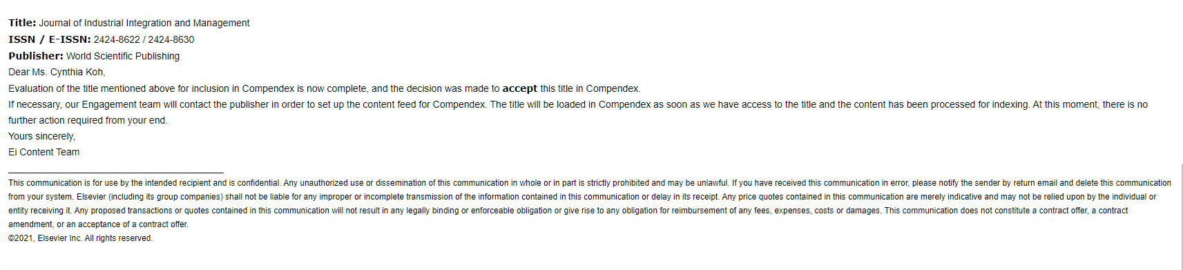 管理公司英文期刊《产业集成与管理:创新与创业》(JIIM:I&E)被批准进入EI Compendex 检索