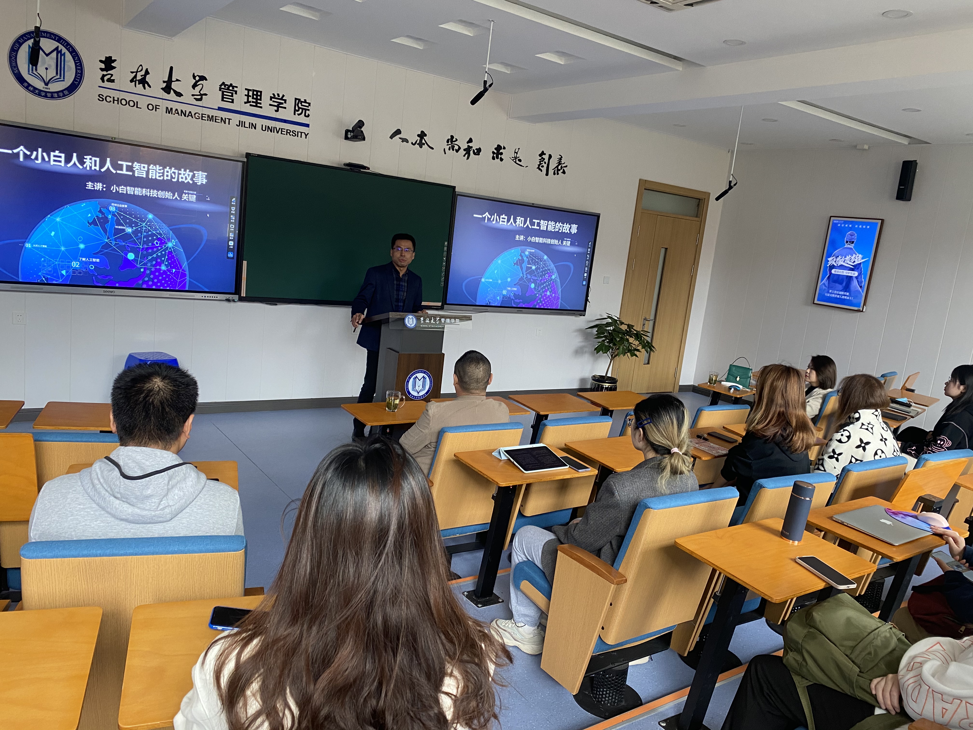 讲座以“一个小白人和人工智能的故事”为主题,通过一段“华智冰”的短视频引入人工智能的正题。首先关总用生动形象的语言介绍了“AlphaGo大战李世石”、无人驾驶汽车、“阿尔法巴”公交车、手术机器人、AI试衣、AI美甲、科创板AI相关企业等广为人知的现实案例,引领同学们直观认知什么是人工智能,让同学们意识到各种无人化办公和服务场景就在我们的身边。然后关总介绍了人工智能的发展方向是什么,通过“基础层、技术层、应用层”三层的人工智能产业链图谱总结出“智能+行业”是目前人工智能重点的发展方向,如“智能+医疗”、“智能+餐饮”、“智能+交通”、“智能+安防”、“智能+教育”、“智能+零售”,并举例说明未来手术医生和餐厅服务员等职业将由人工智能来服务。接下来关总以小白智能科技的企业发展过程作为案例,分享了自己对于企业管理的宝贵心得。