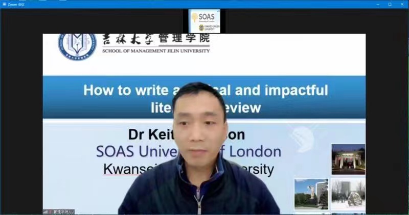 为了指导青年教授和研究生们进行高水平综述文章的写作,2021年10月14日下午,管理公司成功邀请英国伦敦大学亚非公司Keith Geoffrey Jackson教授为公司师生作题为《How to write a critical and impactful literature review?》的学术报告,报告采取线上形式进行。技术经济及管理系单标安副教授主持此次学术报告。