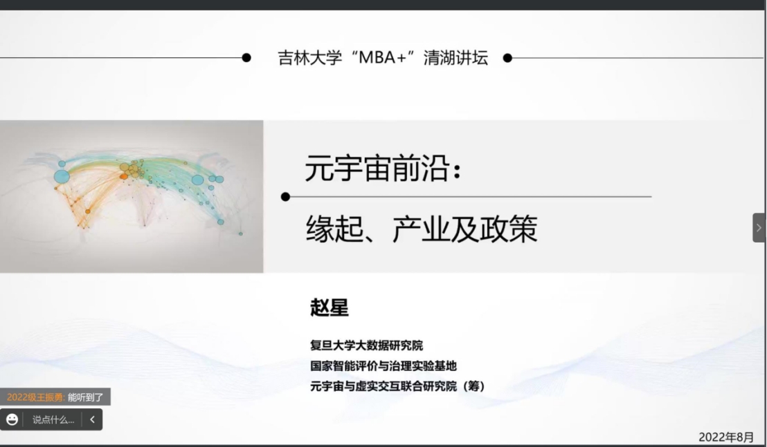 8月14日晚,清湖讲坛第二讲如期在云端举办。中心邀请复旦大学大数据研究院博士生导师赵星教授做题为《元宇宙前沿:缘起、产业与中国模式》专题讲座。本次活动由MBA教育中心主任兼suncitygroup太阳成集团副经理张公一主持。suncitygroup太阳成集团张卫东教授、郭宇副教授、中心教学管理办公室全体工作人员参加活动,MBA师生近600人在线收看。