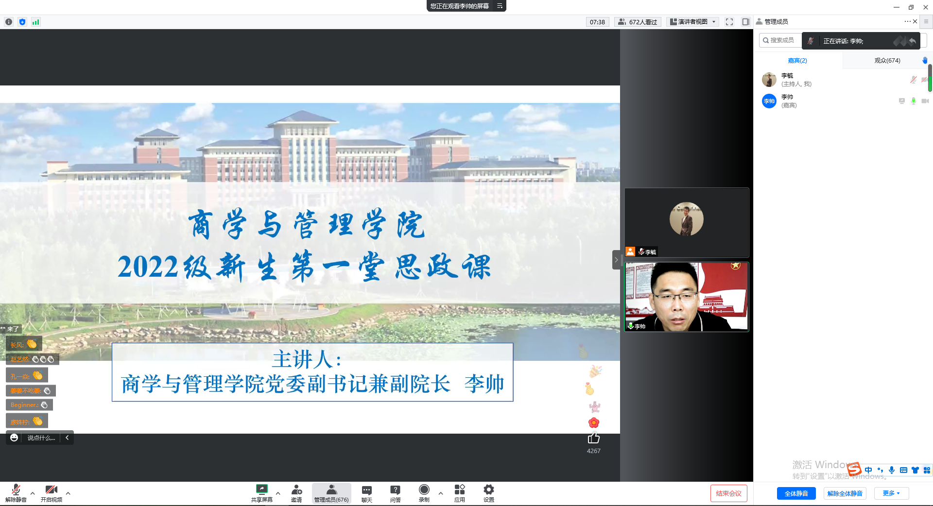 首先,李帅老师对同学们的到来表示祝贺和欢迎,并简单介绍了思政课开设的意义与价值。随后,李帅老师爱自己、爱家人、爱同学、爱党爱国四个方面展开,教育引导同学们树立正确的世界观、人生观和价值观。李帅老师希望同学们从爱自己出发,心怀感恩去爱家人、爱同学,用实际行动践行青春担当,爱党爱国。