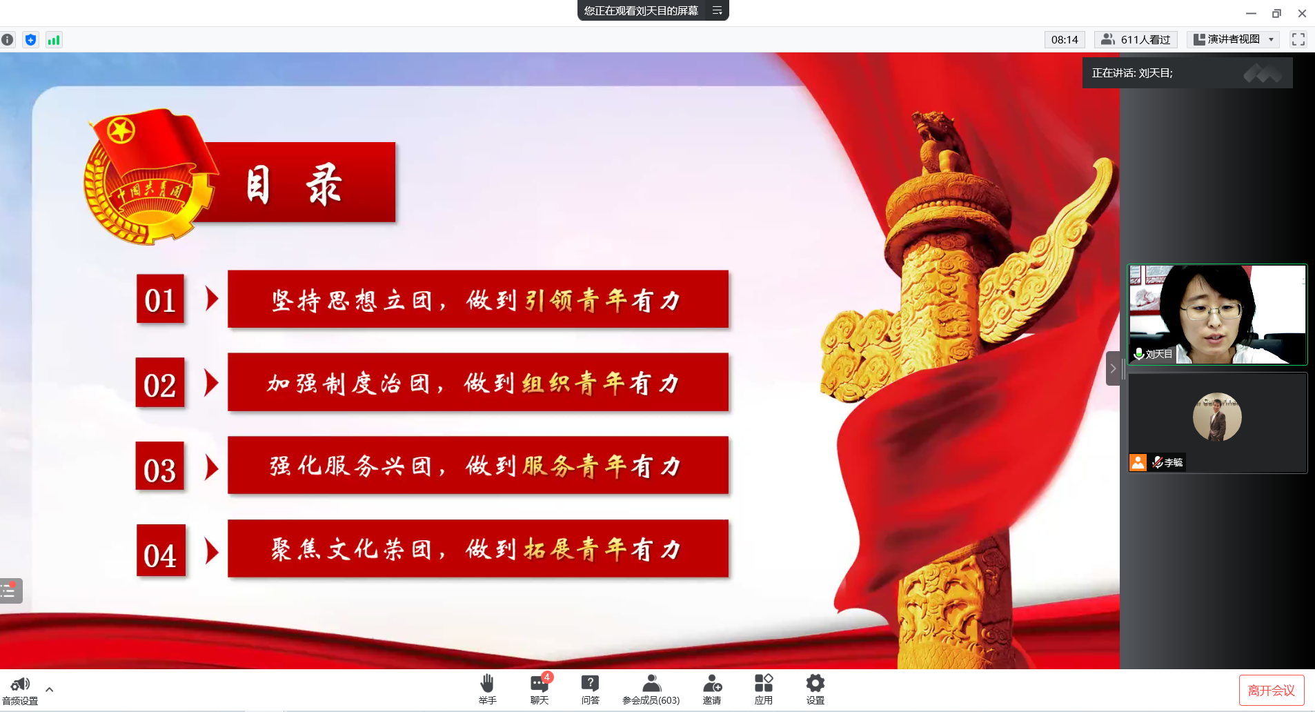 为加强2022级新生的共青团团员意识,深化共青团情怀,增进对党和团的认识,suncitygroup太阳成集团团委书记刘天目老师于2022年8月30日通过腾讯会议为2022级新生举办了“以青春之名,续写时代华章”的线上主题团课活动。