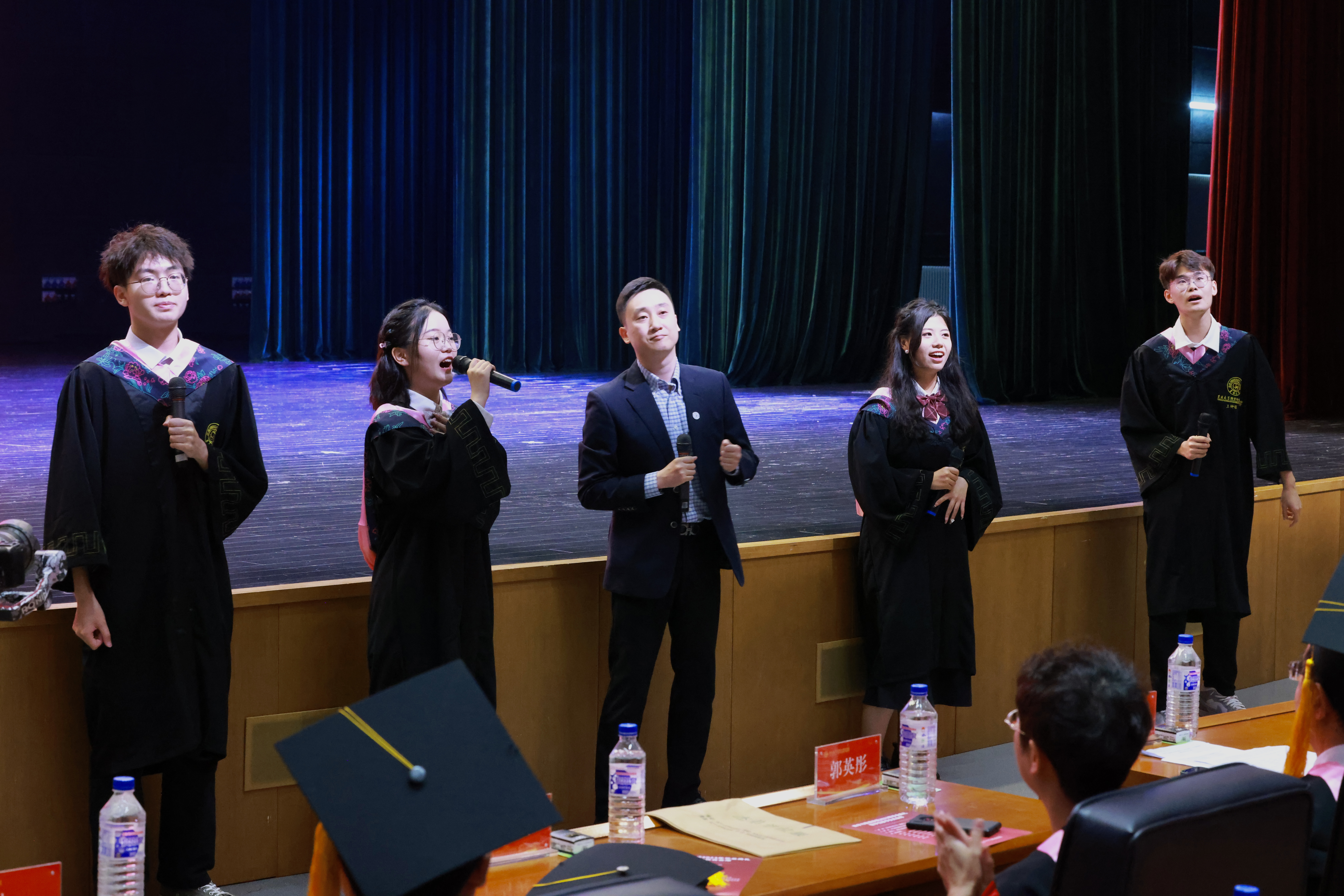 典礼开场前,2019级辅导员刘翔宇老师、陈卓老师与几位研究生同学精心准备了《你曾是少年》《New boys》《星辰大海》等歌曲。清脆悠扬的歌声流转着青春的气息扑面而来,跳跃的音符盛情礼赞着这群闪光的少年,此时此刻,这场不舍的离别,是闪光灯亮起的璀璨星海,是同学们呼喊聚集的热烈青春,情谊永存。