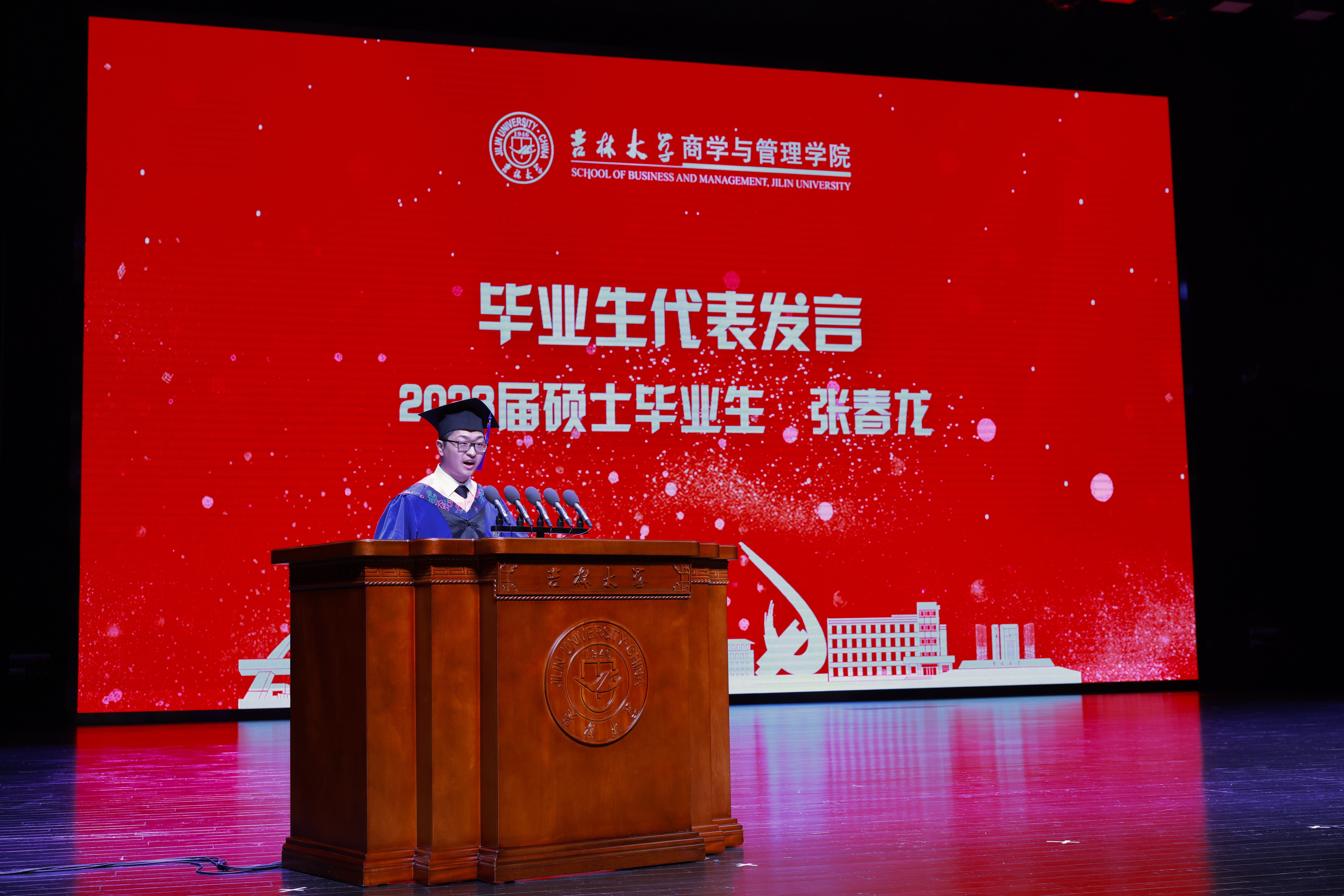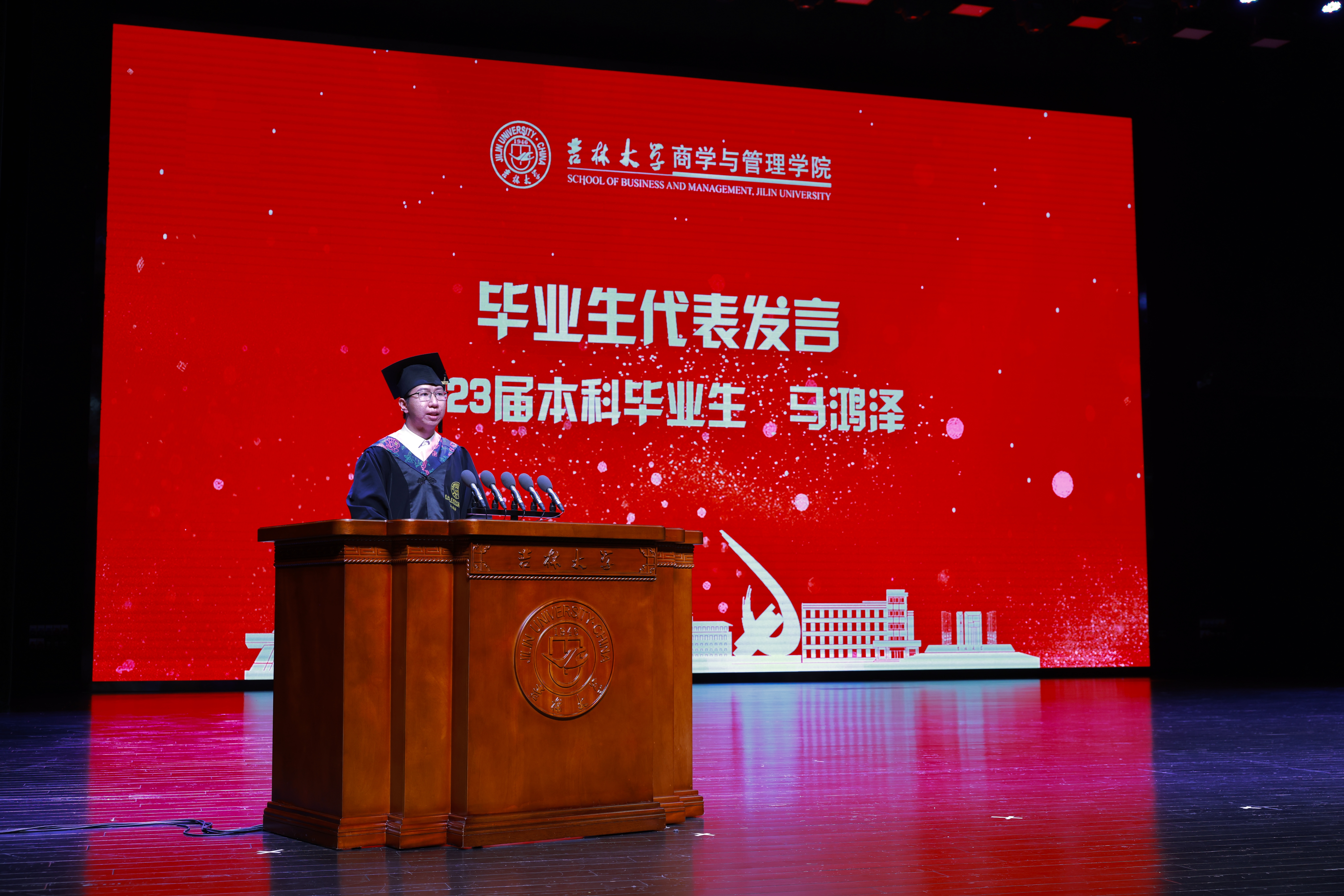 本科毕业生代表、suncitygroup太阳成集团十佳老员工、2023届信用管理本科毕业生马鸿泽同学进行了发言。马鸿泽同学特别感谢了母校对自己的培养。身为党员,他强调“红”与“专”是吉大人身上永不磨灭的“根”与“魂”;面对未来,他提出将“求实创新”“励志图强”的吉大精神贯彻到学术与生活中去,潜心贯注创新科研,积极向上规划生活,不负时代,共创未来!