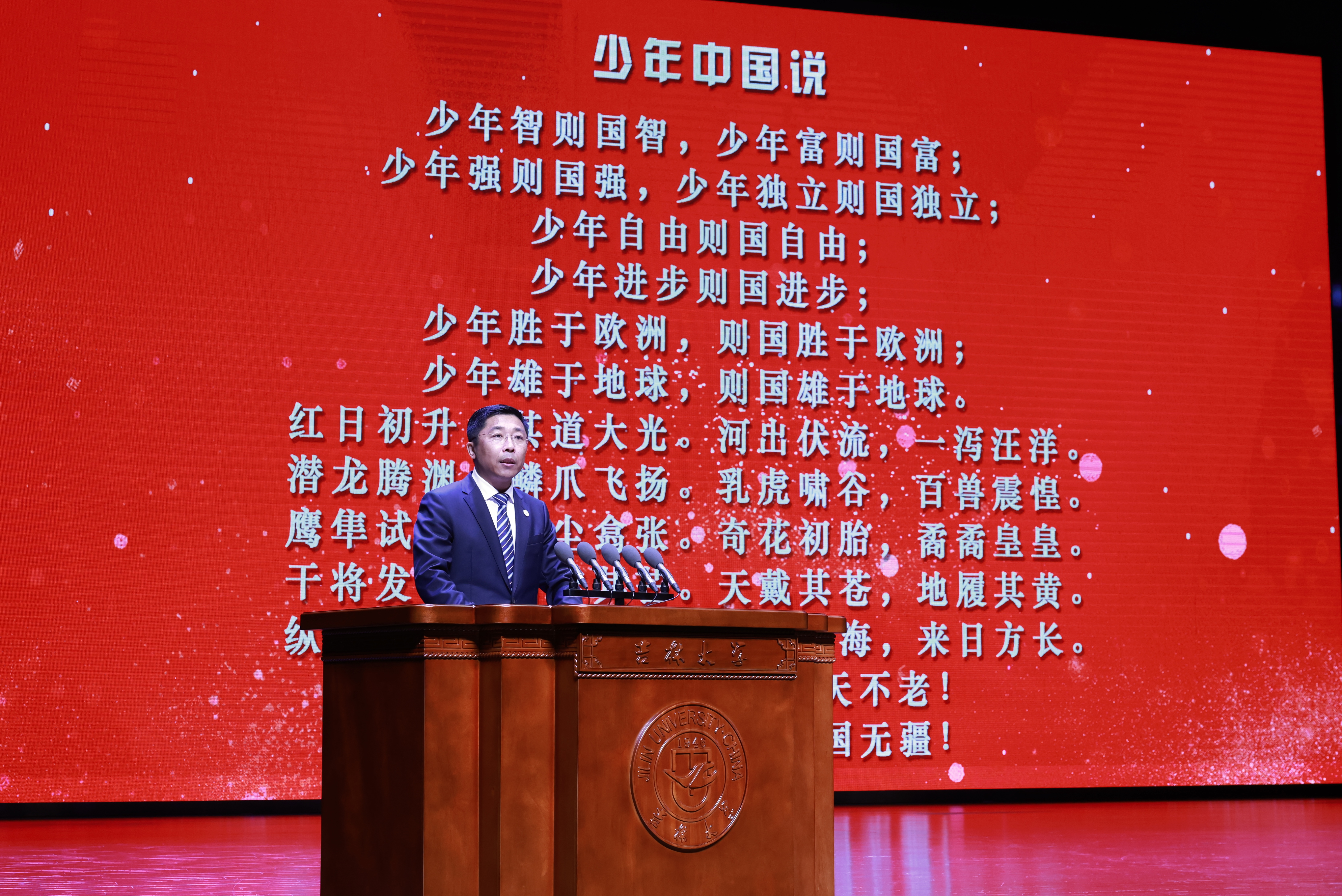 典礼最后,赵军教授带领全体毕业生齐声朗诵《少年中国说》,以声声少年家国的豪迈气概,勉励在场各位同学敢于争先、奋勇向前,立志做有理想、敢担当、能吃苦、肯奋斗的新时代好青年!