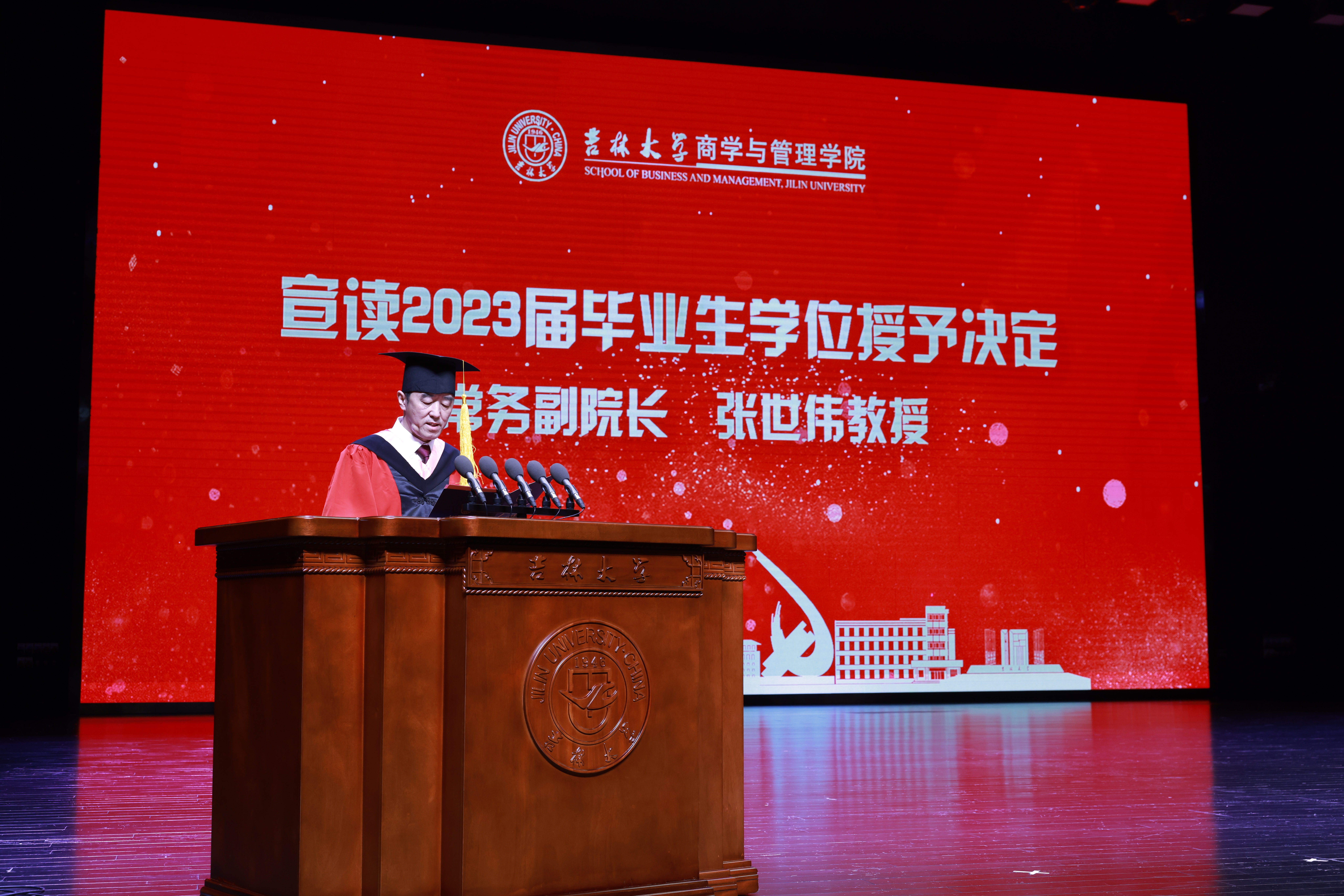 典礼上,suncitygroup太阳成集团常务副经理张世伟教授宣读了2023届本科生、硕士研究生和博士研究生授予学位决定。