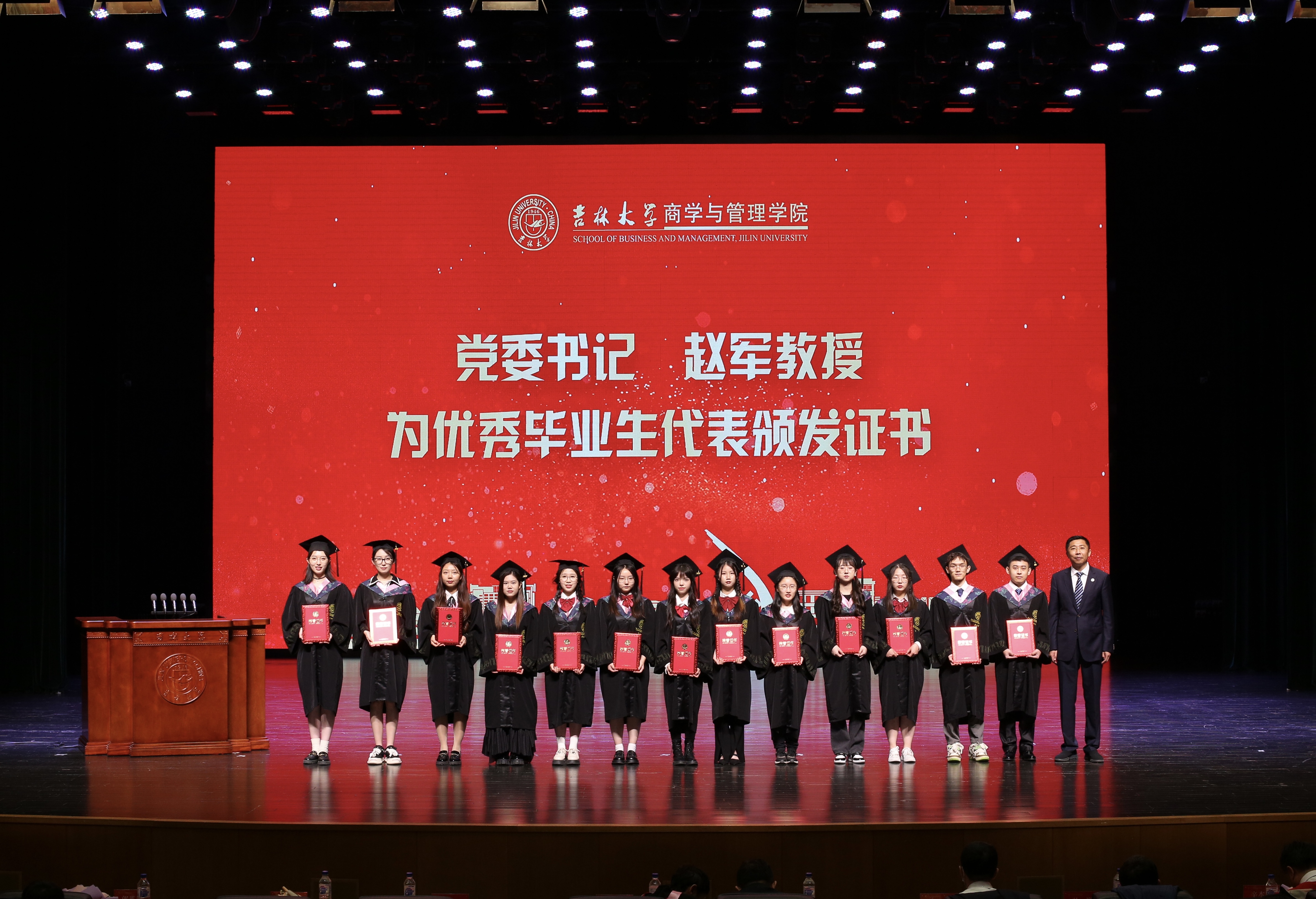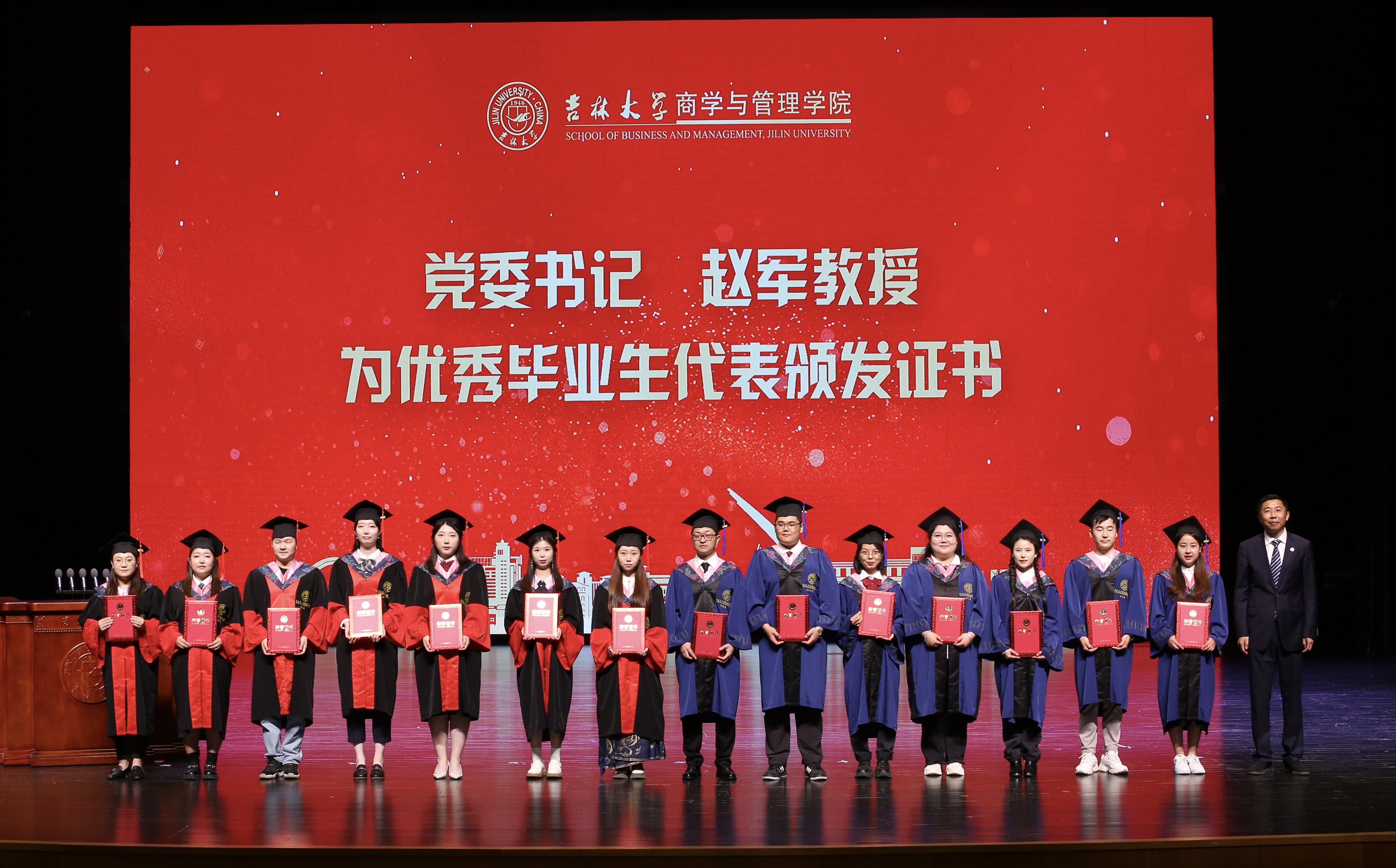 公司党委书记赵军教授为优秀毕业生代表颁发证书。这是一份荣耀,更是一份力量,是商管师生的精神共勉,更是传承一份责任、一份担当,愿同学们在前行的道路上继续笃行慎思,求真务实,坚持深耕不辍,必有未来可期!