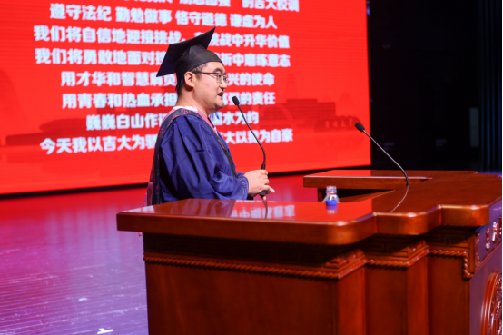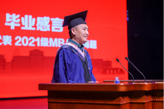 典礼上,毕业生代表2021级MBA田海超进行了发言。他感恩母校提供的良好平台以及老师们的辛勤付出,他相信毕业不是终点,祝愿同学们在奔赴未来的道路上始终保持对生活的热爱,对知识的渴求,对展翅高飞的憧憬,积极拥抱每一个机遇,勇敢面对每一个挑战,不断获得奋勇前进的强大力量。