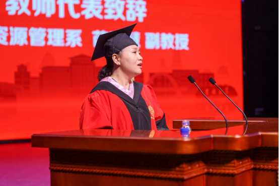 典礼上,人力与资源管理系苗宏慧副教授,作为教师代表进行了发言。苗老师首先祝贺全体研究生顺利毕业,再次展翅高飞,奔赴江海。其次,她表达了对毕业生们的希冀,勉励同学们艰苦奋,再展万里鸿鹄志,自强不息,争做参天栋梁材。同时寄语大家,时如白驹兮,情意绵,依依不舍兮,送君别;厚积薄发兮,鸿鹄志,大鹏展翅兮,报家国。