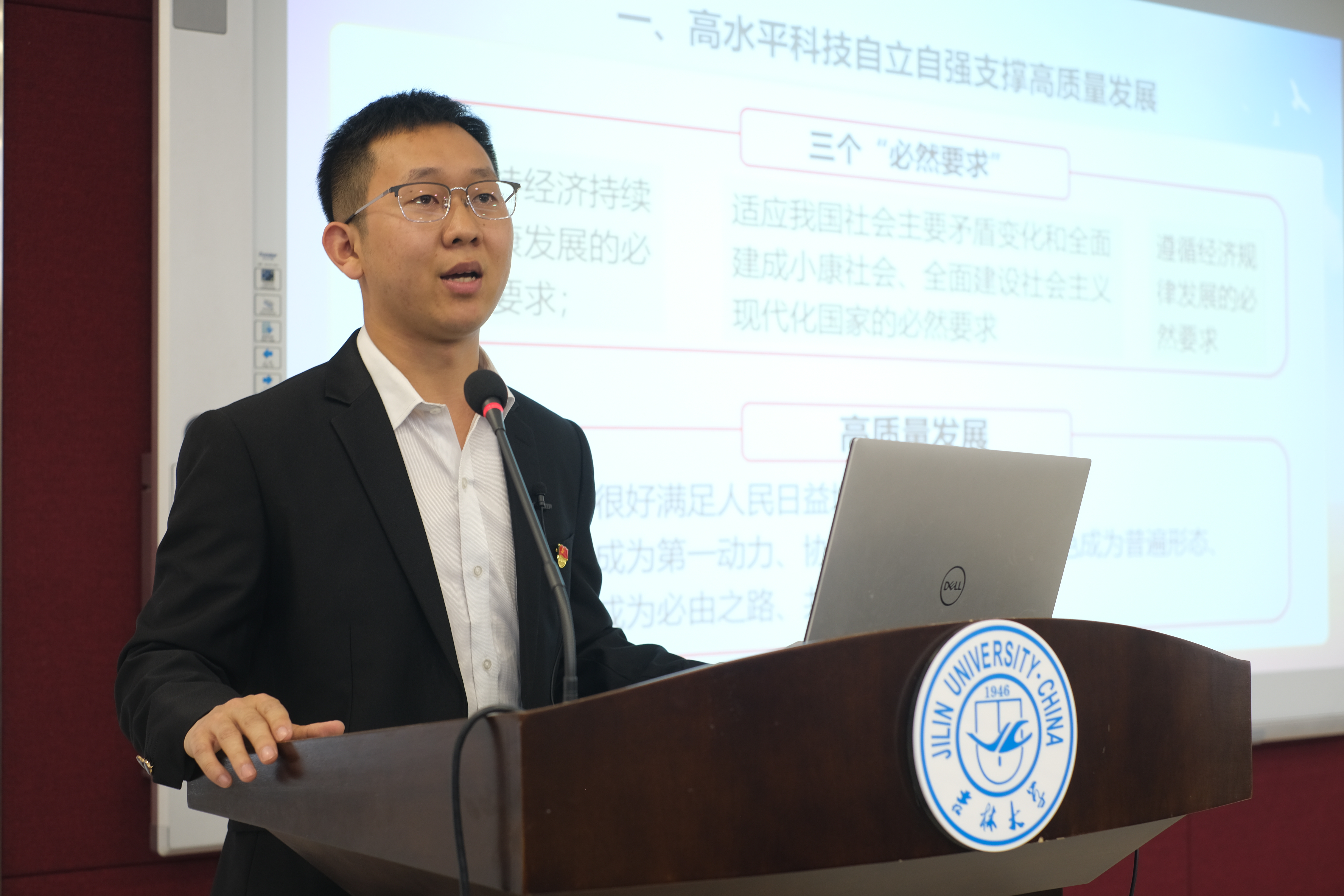 科技兴则民族兴,科技强则国家强。在此次宣讲中,蒋理从“高质量发展”的提出与意义入手,着眼于我国经济社会发展面临的新形势新问题,引入以创新推动高质量发展的主题。党的二十大报告中对科技创新进行了详细的论述与部署,习近平总书记在参加十四届全国人大一次会议江苏代表团审议时也进一步强调“加快实现高水平科技自立自强,是实现高质量发展的必由之路”,深刻彰显了科技创新和高水平科技自立自强在我国社会主义现化建设全局中的重要战略地位。蒋理从“高水平科技自立自强支撑高质量发展”的角度,分析了科技创新的新趋势和新布局,结合自身的专业背景给大家介绍了我国科技创新取得的重大成果和面临的“卡脖子”技术,让大家认识到我国在实现高水平科技自立自强上具有的现实基础,也深刻体会到进一步推动科技创新的迫切必要性。