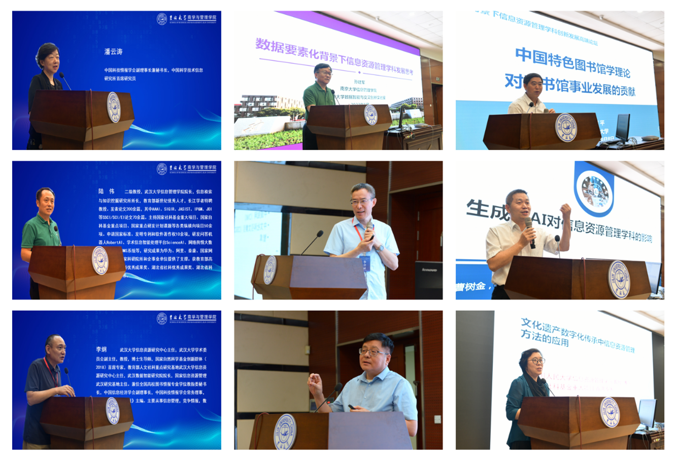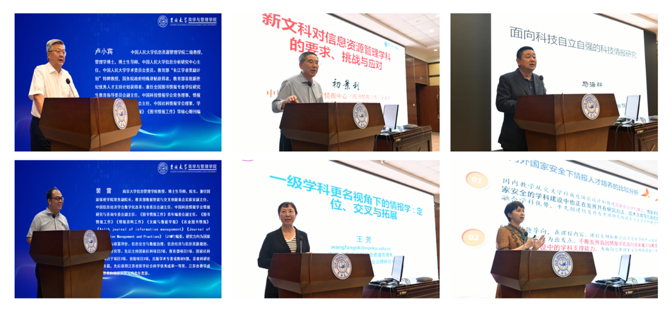 孙建军教授详细解读了数据要素化背景下信息资源管理学科的未来发展;柯平教授结合中国特色图书馆学理论对图书馆事业发展的影响,阐述图书馆学理论对其实践发展的突出贡献和重要影响;朱庆华教授梳理了信息资源管理学科发展史,并指出投入少产出大、规模小见效快和渗透广支撑强,是信息资源管理学科相较其他社会科学的突出优势和特点,也是学科未来发展应注重的方向;曹树金教授以“生成式AI对信息资源管理学科的影响”为题详细探讨信息资源管理学科在最新技术影响下的发展趋势;周庆山教授从数智技术变化入手,梳理了信息资源管理领域技术演进及其规则应对策略;周晓英教授从文化强国建设战略要求入手,探讨了图书情报方法在文化遗产数据资源建设中的应用途径及其可能性。初景利教授明确了新文科在鼓励学科交叉融合、重视技术方法应用、强调团队建设效果和支撑国家战略需要等方面的核心特征,并指出信息资源管理学科应从定位明确、课程体系设计、团队多元化、员工应用能力培养和大学科作用发挥等多方面形成独特的学科优势特色;马海群教授以“面向科技自立自强的科技情报研究”为题,突出强调新时代的情报学研究发展在学科体系、学术体系、话语体系和学术共同体等各个方面的未来潜力和发展方向;王芳教授从学科更名视角入手,阐述情报学定位、交叉与发展的未来前景;最后,王晰巍教授结合新技术发展背景下严峻的国际安全局势,论述总体国家安全观下情报人才的实际需求,就未来人才培养体系、模式和可能进行了深入分析和探讨。