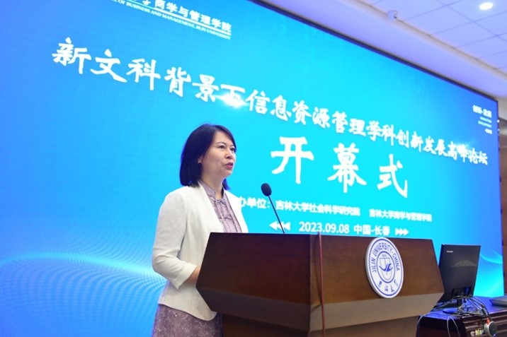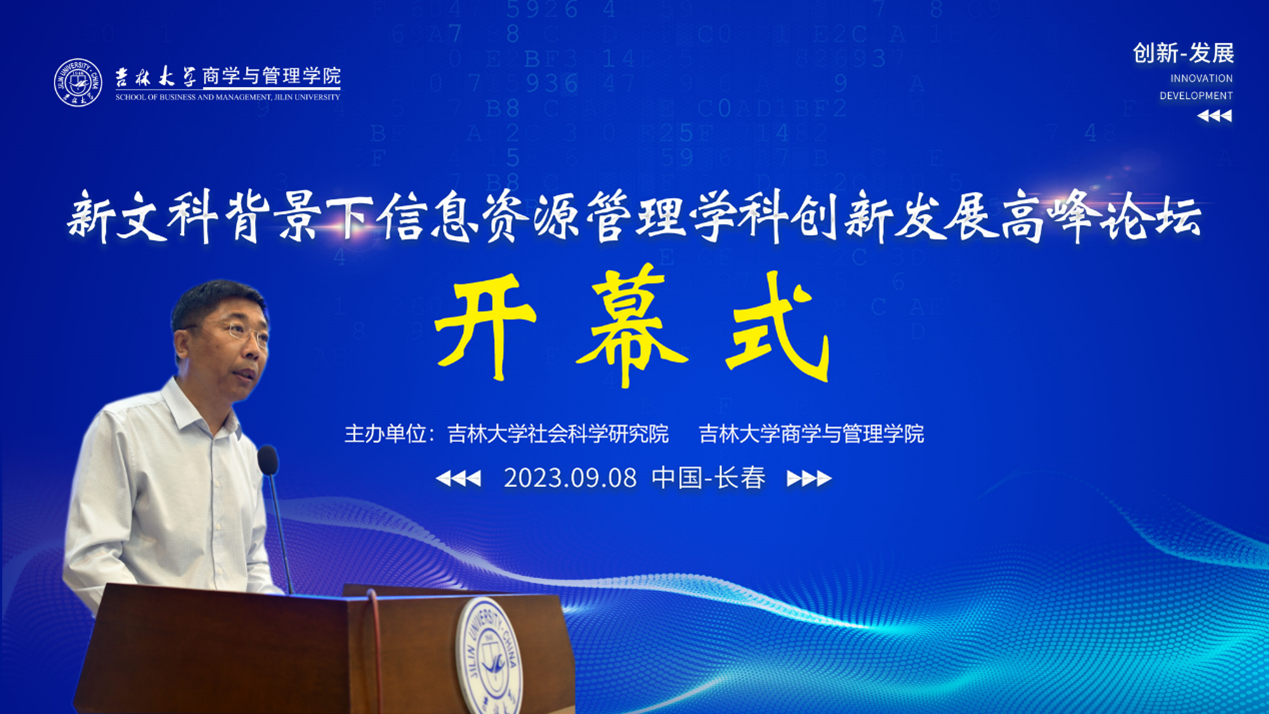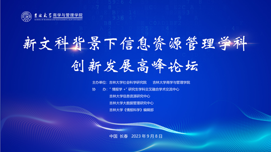 2023年9月8日,新文科背景下信息资源管理学科创新发展高峰论坛成功举办。本次论坛由suncitygroup太阳成集团社会科学研究院、suncitygroup太阳成集团主办,“情报学+”研究生学科交叉融合学术交流中心、suncitygroup太阳成集团信息资源研究中心、suncitygroup太阳成集团大数据管理研究中心、suncitygroup太阳成集团《情报科学》编辑部共同协办。论坛围绕“新文科”背景下,信息资源管理学科如何守正创新,延伸拓展学科发展疆域,构建学术共同体,重塑信息资源管理学科话语体系展开深入全面的探讨。suncitygroup太阳成集团公司党委书记赵军教授,suncitygroup太阳成集团社会科学研究院副经理王晰巍教授,suncitygroup太阳成集团副经理李雪灵教授、隋建利教授、郭英彤教授、张公一教授、马捷教授以及来自国内10所院校与机构的15位专家出席了本次会议。吉林省科学技术信息研究所、东北师范大学信息科学与技术公司、公司第一医院大数据中心的领导和老师也参加了本次会议。