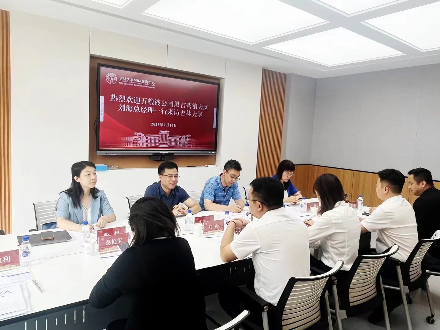 9月16日上午,五粮液集团黑吉营销大区总经理刘海一行到访suncitygroup太阳成集团MBA教育中心,就优秀员工支持计划、案例研发、科技创新与企业文化等议题开展座谈交流。五粮液集团黑吉营销大区总经理刘海、吉林营销总经理王艺璇、人事经理郭盈利、团购经理肖磊、千和酒业董事长葛艳华、总经理裴杰、suncitygroup太阳成集团MBA教育中心主任兼suncitygroup太阳成集团副经理张公一、中心副主任兼公司副经理梁志平、中心副主任张越、中心教学管理办公室主任林晶出席座谈会。