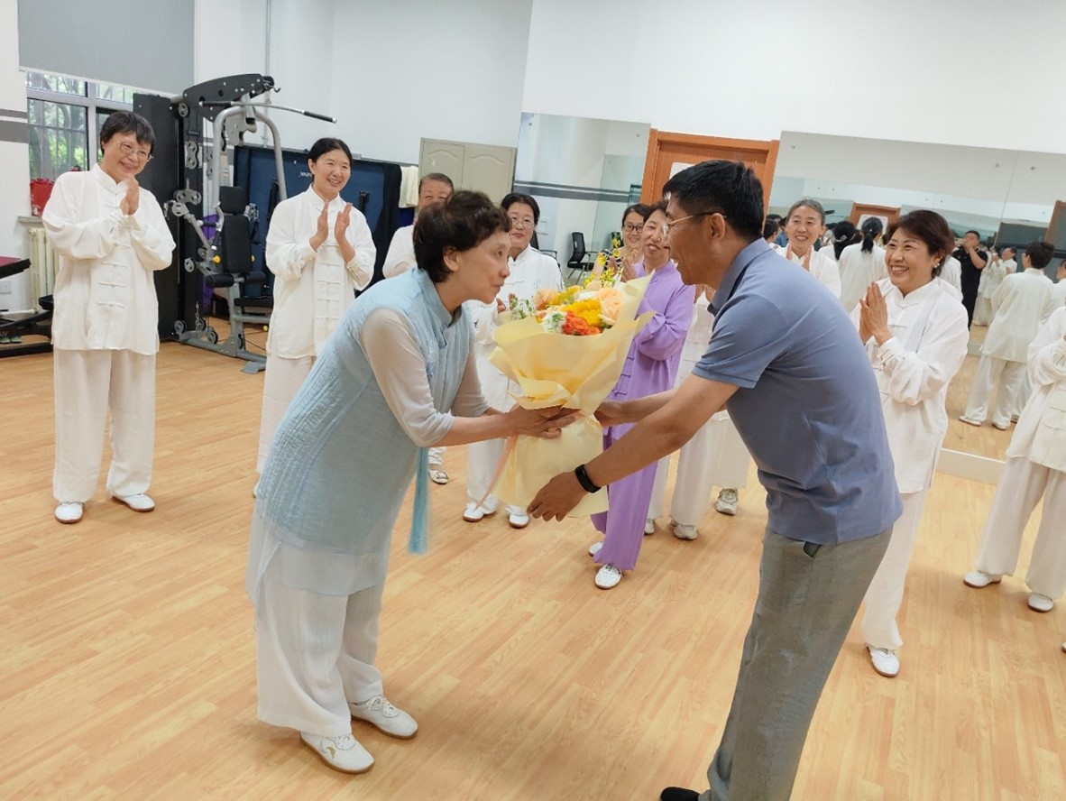 观看了太极拳社团的老师们精彩的太极拳后,党委书记赵军向教练张秋惠老师致以公司的问候。他说,公司的太极拳社团作为教职工的兴趣爱好社团,走过了7年多的时光,公司的教职工们在这里留下了宝贵的集体记忆,在练习拳法中增进了了解,加强了连结,也是suncitygroup太阳成集团心灵融合工作成效的有力体现。随后,赵军书记代表公司向张秋惠老师献上鲜花,感谢张老师过去7年来对公司文体事业的大力支持。