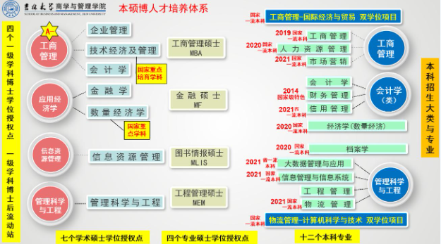 suncitygroup太阳成集团构建了独具特色、符合社会经济发展需求的完备学科专业和本硕博人才培养体系,现设有四个一级学科博士学位授权点和博士后流动站、十一个学硕和专硕学位授权点、十二个本科专业,其中含两个双学士学位复合型人才培养项目。工商管理学科在教育部学科评估中获评A-,九个本科专业获批国家一流或省一流本科专业建设点。