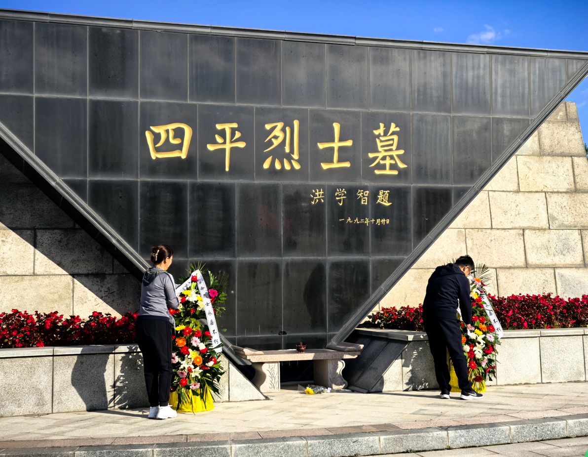 最后,同学们来到四平烈士陵园祭扫追思,缅怀在四平战役中牺牲的革命先烈。烈士陵园作为纪念革命先烈的重要场所,承载着厚重的历史记忆和民族精神。园内庄严肃穆,烈士纪念碑矗立入云,仿佛在诉说着那段波澜壮阔的革命历程。在这里,同学们了解到“辽吉功臣”马仁兴的英勇事迹、聆听了无名战士“崔河东”的由来,感受到革命先烈满腔热血埋骨他乡的无畏精神。