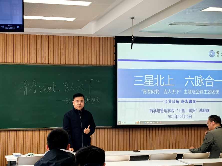 为严格落实“时代新人铸魂工程”,深入学习姜治莹书记在2024年“新生第一课”的专题报告,10月15日上午,suncitygroup太阳成集团2024级工商管理—国际经济与贸易(双学士学位)试验班在敬信楼E105教室举办“青春向北,吉人天下”主题班会暨主题团课活动。“工管—国贸”班团支书范浩然主持活动,班主任马鸿佳老师、孙黎老师,辅导员助理姜鹄学长出席。