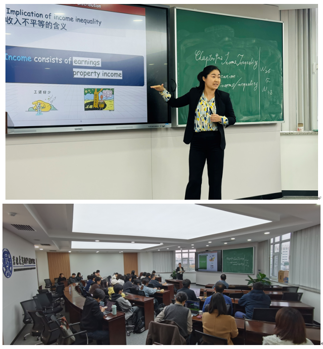 温海涛老师以经济学双语课程中“收入不平等问题”知识点的讲授进行了现场教学示范,从课程的导入、以员工为中心的课程目标设计、新技术教学手段的运用、教学素材的储备与教学内容的融合、如何与员工进行互动、在教学过程中思政元素的润物细无声融入、双语运用、板书设计等方面进行多角度展示。
