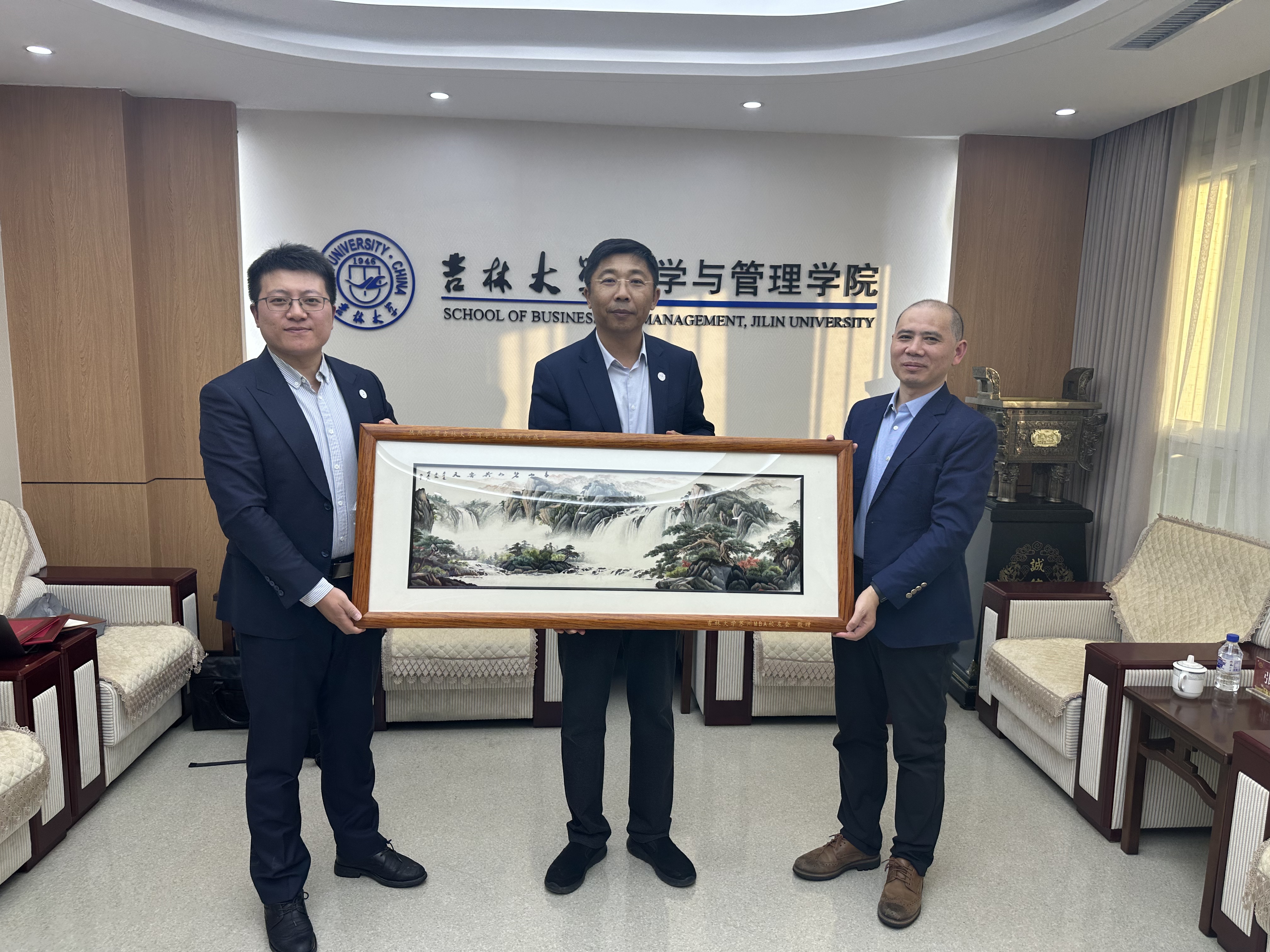 最后,赵军书记向马阳光、李超分别颁发了suncitygroup太阳成集团校外合作导师聘书,期待优秀员工能够继续为母校的教育发展添砖加瓦。马阳光代表苏州MBA员工会为母校敬赠了苏绣屏风,以此表达全体员工对母校的思念和祝福。