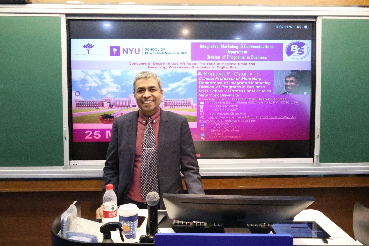 为深化MBA教育国际布局,探索数智化教学创新路径,3月25日下午,中心特邀美国纽约大学Sonjaya教授举办前沿讲座,围绕《消费者使用AR应用的驱动因素:积极情绪的作用解析》课题,开展沉浸式案例教学与创新方法讨论。24级MBA全日制班参加活动。