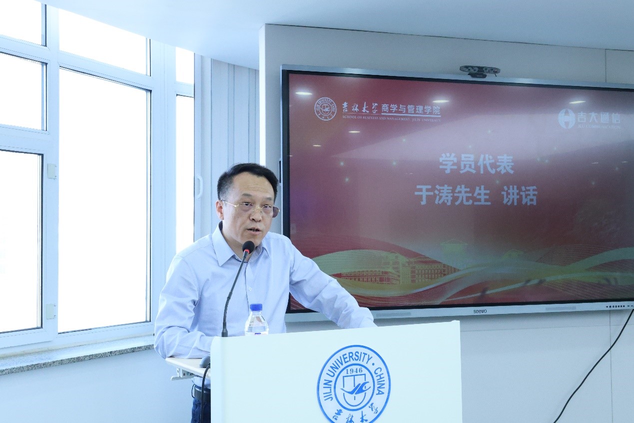 学员代表于涛讲话。他期待与各位同窗携手,在知识瀚海中智慧激荡,在创新征途上携手成长,共同进步。