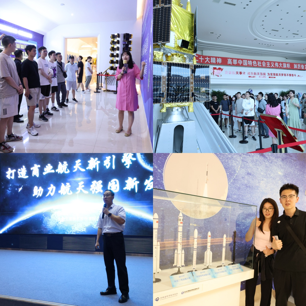 活动伊始,同学们步入宽阔的展厅,展厅正中陈列着“吉林一号”组星发射状态等比模型。2015年10月7日,长光卫星研制的4颗遥感卫星成功发射入轨,由此开启了“吉林一号”星座建设征程,正式拉开了中国商业航天发展的序幕。随后,在讲解员细致的讲述下,同学们参观了航天科普展区,了解不同种类卫星的设计外观和功能,了解卫星作业的设备和流程。最后长光卫星党委办公室、综合办公室主任张晓磊为同学们做题为《打造商业航天新引擎 助力航天强国新发展》的专题讲座。