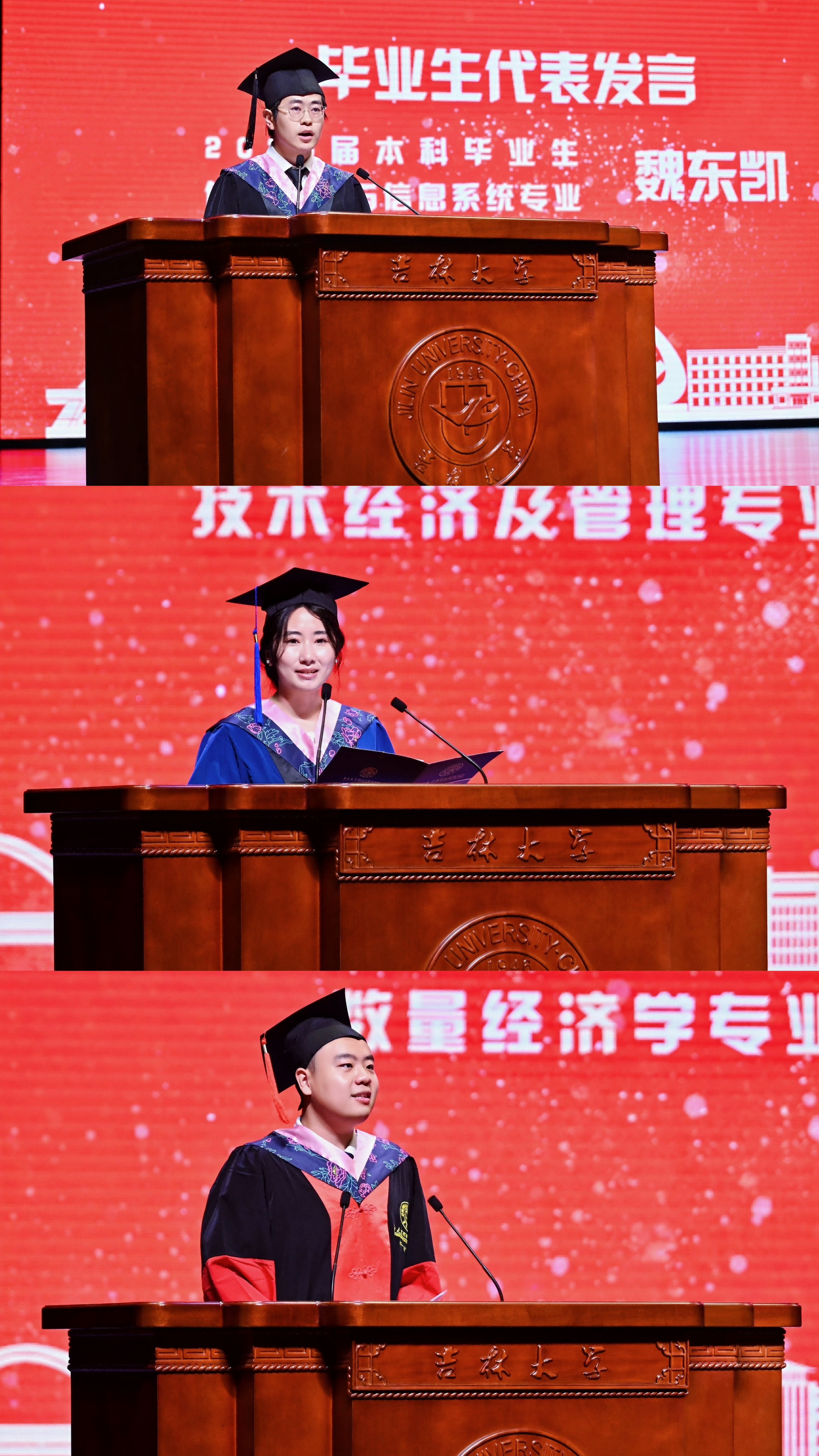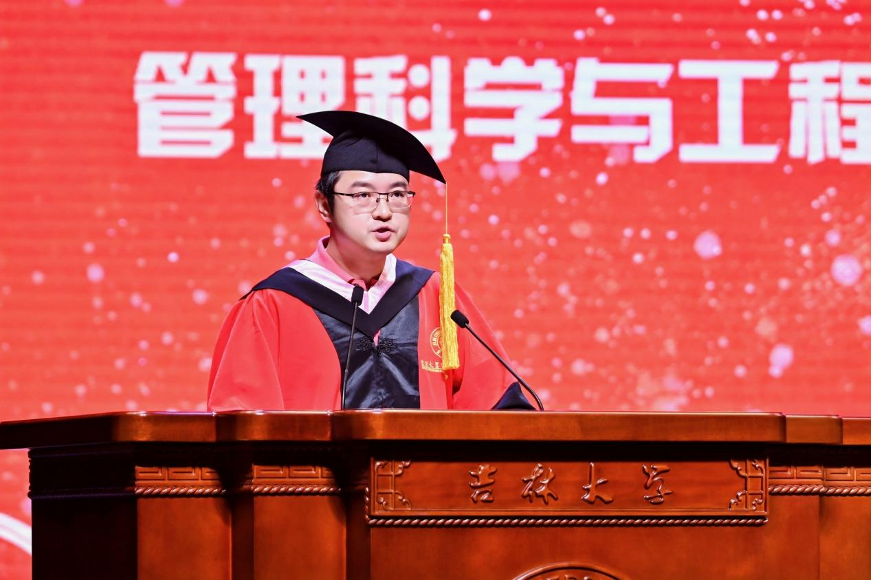 典礼上,本科毕业生代表魏东凯、硕士毕业生代表高盼、博士毕业生代表郝一哲依次发言,他们讲述了自己自强自立、勤学笃行的求学经历,分享了求学期间的感人故事,用支教兴边的实际行动表达对母校和公司的感激之情,并承诺将传承吉大人“求实创新,励志图强”的校训精神,在时代舞台上以青春之力诠释责任担当,为理想信念不懈拼搏,不负公司的教诲和嘱托。
