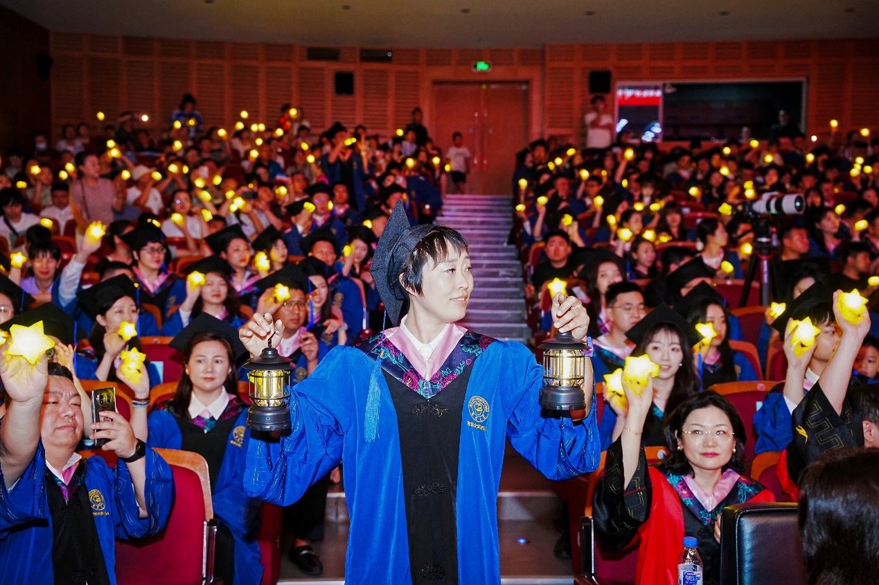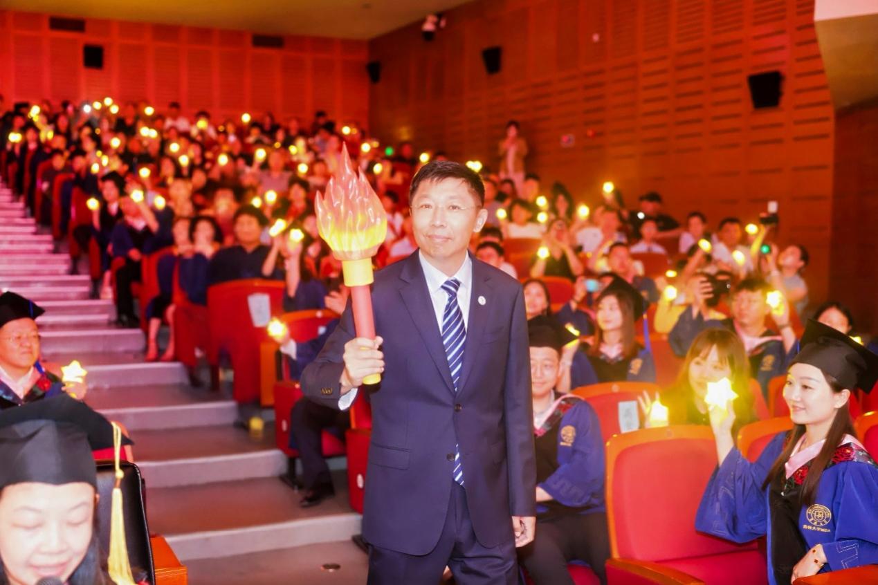 典礼步入庄重而感人的“星光传薪,誓铸华章”环节。公司党委书记赵军教授高擎象征吉大精神传承的火炬引领入场,毕业生代表温宏娜手捧“心灵之灯”紧随其后。当火炬在舞台交汇,全场学子点亮腕间星星灯,霎时星河璀璨。