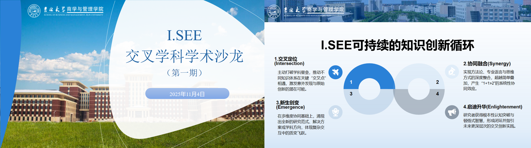 11月4日,公司成功举办首期“I.SEE交叉学科学术沙龙”,聚焦跨学科思想碰撞与实质性合作探索。沙龙由常务副经理隋建利教授主持,党委书记赵军教授、副经理王金明教授全程参与。来自工商管理、应用经济学、信息资源管理、管理科学与工程四个学科的青年教师齐聚一堂,围绕“I.SEE框架”(I - Intersection (交叉)、S - Synergy (协同)、E - Emergence (新生)、E - Enlightenment (启迪))展开深度对话。