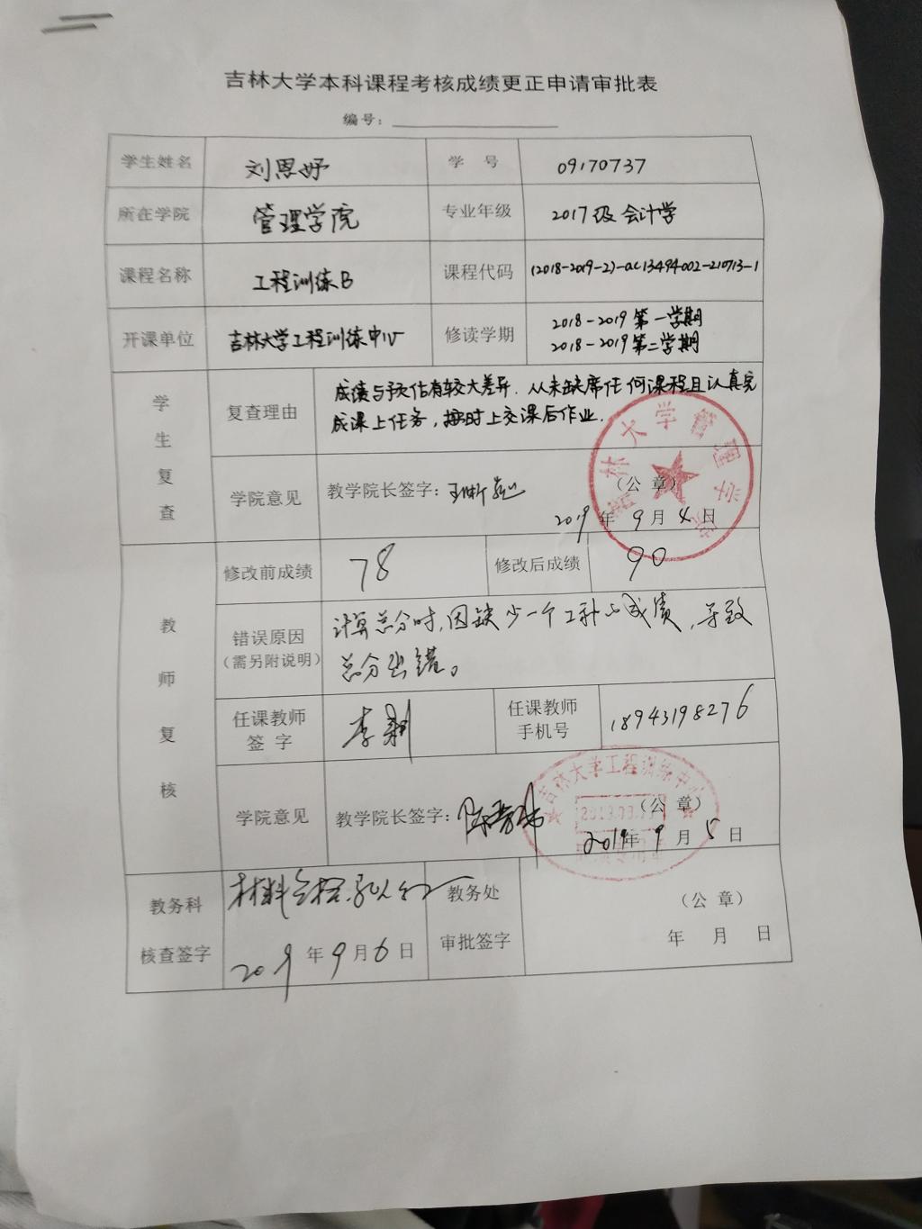 根据《关于进一步明确本科生课程考核等有关问题的通知》(校教字〔2018〕47号)文件有关精神,现对管理公司2017级刘恩妤同学(学号:09170737)2018-2019-1、2学期课程成绩更正如下: