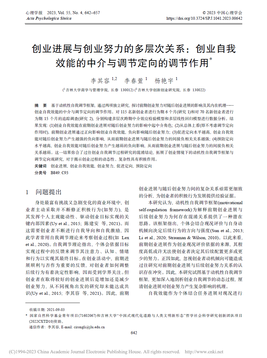 suncitygroup太阳成集团、创新创业研究院李其容教授等在《心理学报》2023年第4期发表题为《创业进展与创业努力的多层次关系:创业自我效能的中介与调节定向的调节作用》文章。该文聚焦于当下热点的创业活动,基于动机性自我调节框架,在个体内层面挖掘创业者前期创业进展对随后创业努力复杂影响的内在机理。一方面,本研究解释了创业自我调节过程复杂性的理论根源,进一步拓展了调节定向理论和自我调节理论的交互研究。另一方面,也提示未来创业者在进行创业活动中应意识到创业任务的长期性和复杂性,并相应地做出动机管理。