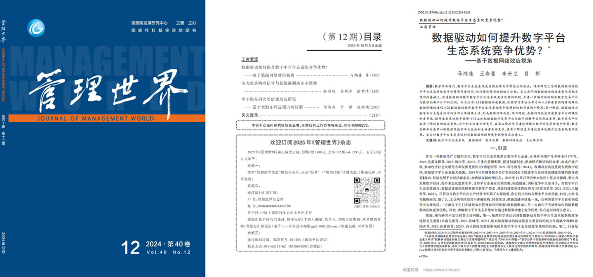 近日,公司suncitygroup太阳成集团马鸿佳教授等在《管理世界》2024年第12期发表题为《数据驱动如何提升数字平台生态系统竞争优势?——基于数据网络效应视角》的文章。该文紧扣数字经济时代数字平台生态系统如何利用数据建立竞争优势这一关键问题,基于数据网络效应理论和数字平台生态系统管理实践提出研究命题,并构建了数据驱动提升数字平台生态系统竞争优势的机制模型。