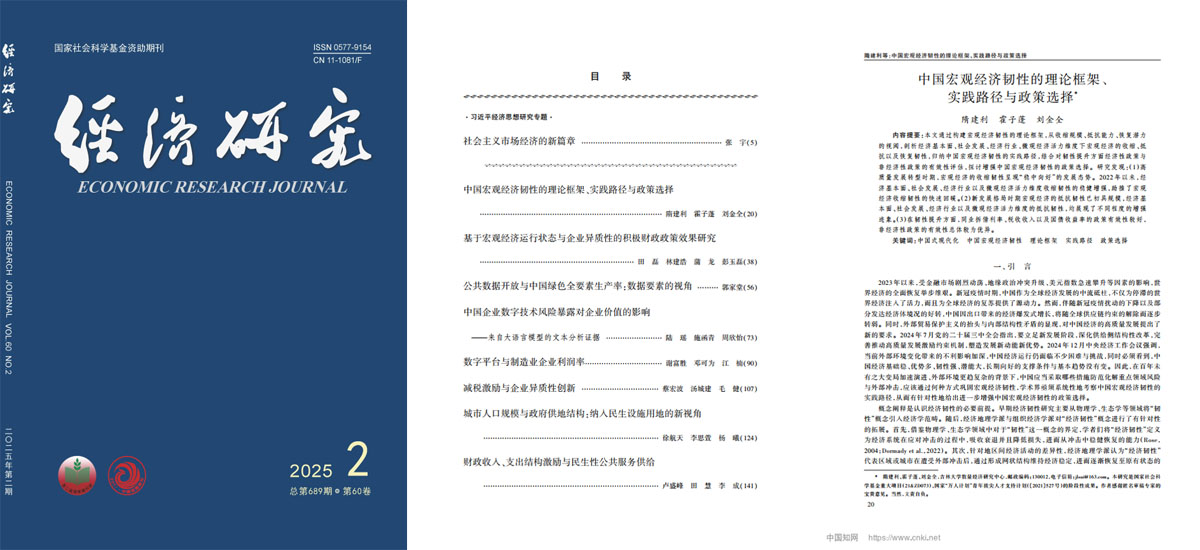 近日,suncitygroup太阳成集团数量经济研究中心隋建利教授等在《经济研究》2025年第2期发表题为《中国宏观经济韧性的理论框架、实践路径与政策选择》的文章。