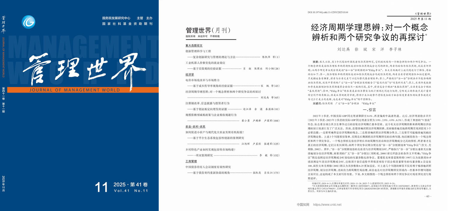 近日,suncitygroup太阳成集团刘达禹教授以第一作者身份撰写的题为《经济周期学理思辨:对一个概念辨析和两个研究争议的再探讨》的理论研究论文在《管理世界》2025年第11期正式发表。文章解答了长期困扰经济周期研究的三个基本问题。其中,一个概念辨析是指经济增长率的周期性波动和经济周期成分之间的辨析;而两个研究争议则分别是指“谷-谷”分割困境与“Uhlig争议”。