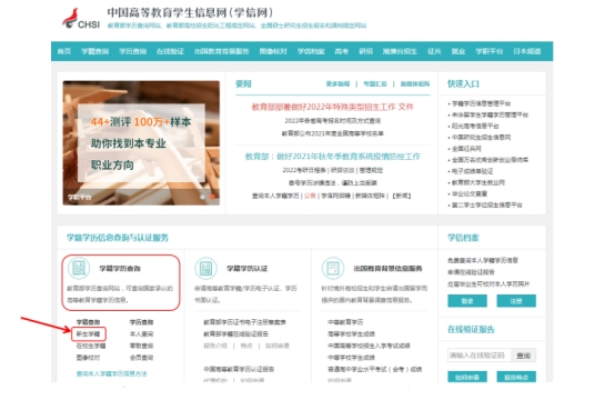 2.按网站提示注册学信网用户后,点击“学籍学历查询”——“新生学籍”查询。