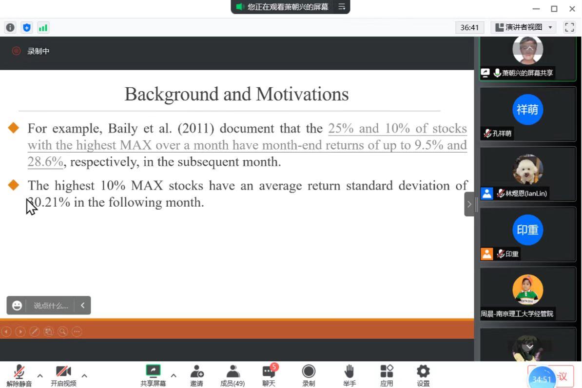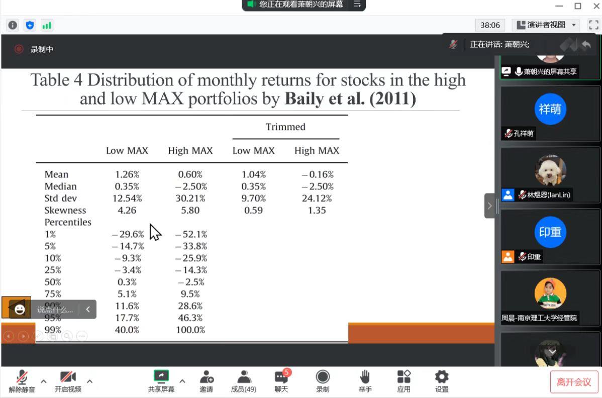 报告结束之后,林煜恩老师提出了只用少量股票进行检测,以及结算时间的建议,给萧教授带来了很多灵感;聂丽副教授对于机构投资者的分类提出了建议,可以对投资者进行更细的分类,萧教授也提出了机构投资者和散户之间的差距,以及缺少对于投资者分类的数据库的现状。