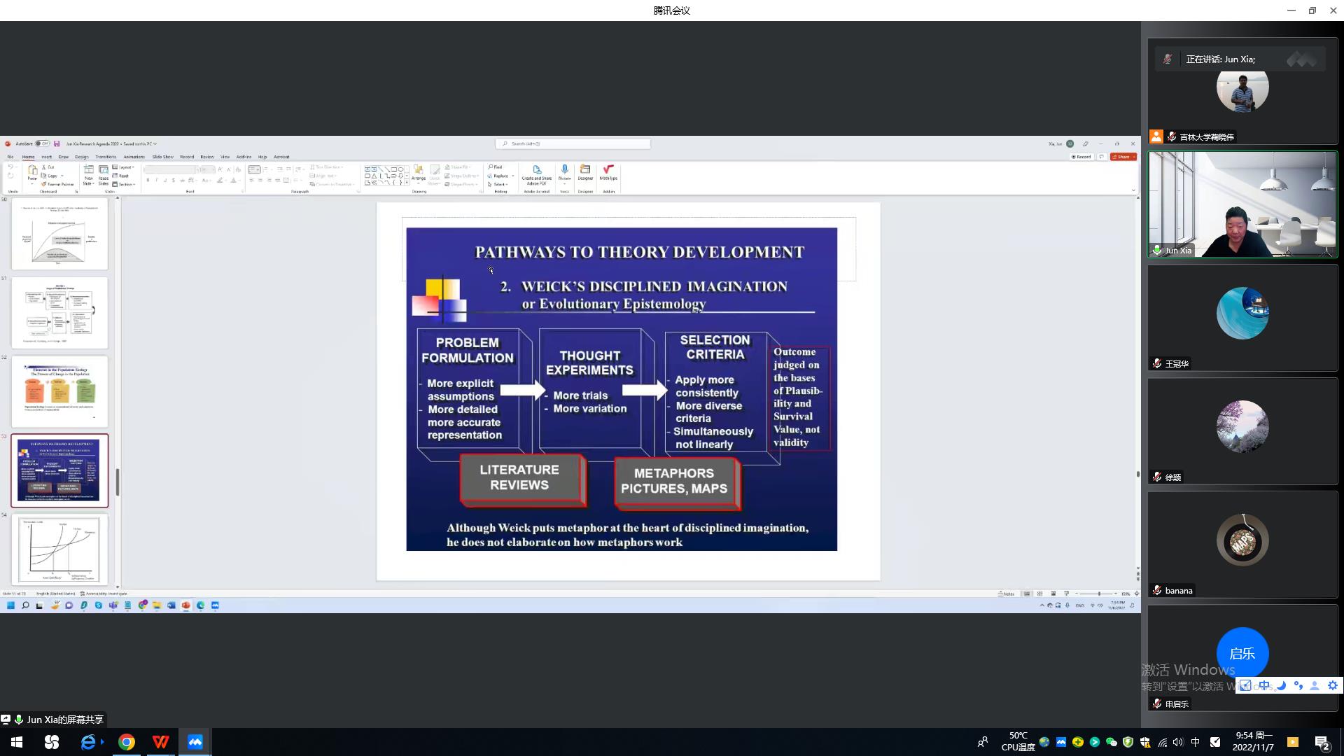 第二场讲座题为“Mechanism and assumption”。夏军教授围绕“Theory construction as social construction”的主题展开,认为理论的建构一定离不开训练有速的想象力。那么,理论是怎么产生的呢?主要有两方面:一是达尔文进化论,从Variation到Selection再到Retention。另一个是Weick在1999年提出的“Problem Formulation, Thought Experiments, Selection Criteria”的过程。随后,夏老师通过分享几组图片与师生互动来说明每个人看事物的角度是不同的,而由此产生的问题便是由于看问题的角度不同导致大家对同一篇文章的看法不同。夏教授强调“Imagination”的能力是非常重要的,这种思想是写文章的生命之源,只要找到了适合自己的理论,然后Make sense,通过不断的积累,不断的做,最后写出的文章自然地就会超越前人。讲座为师生们提供了非常有益的思考和帮助,极大地开阔了同学们的科研视野,得到在场师生的一致好评。