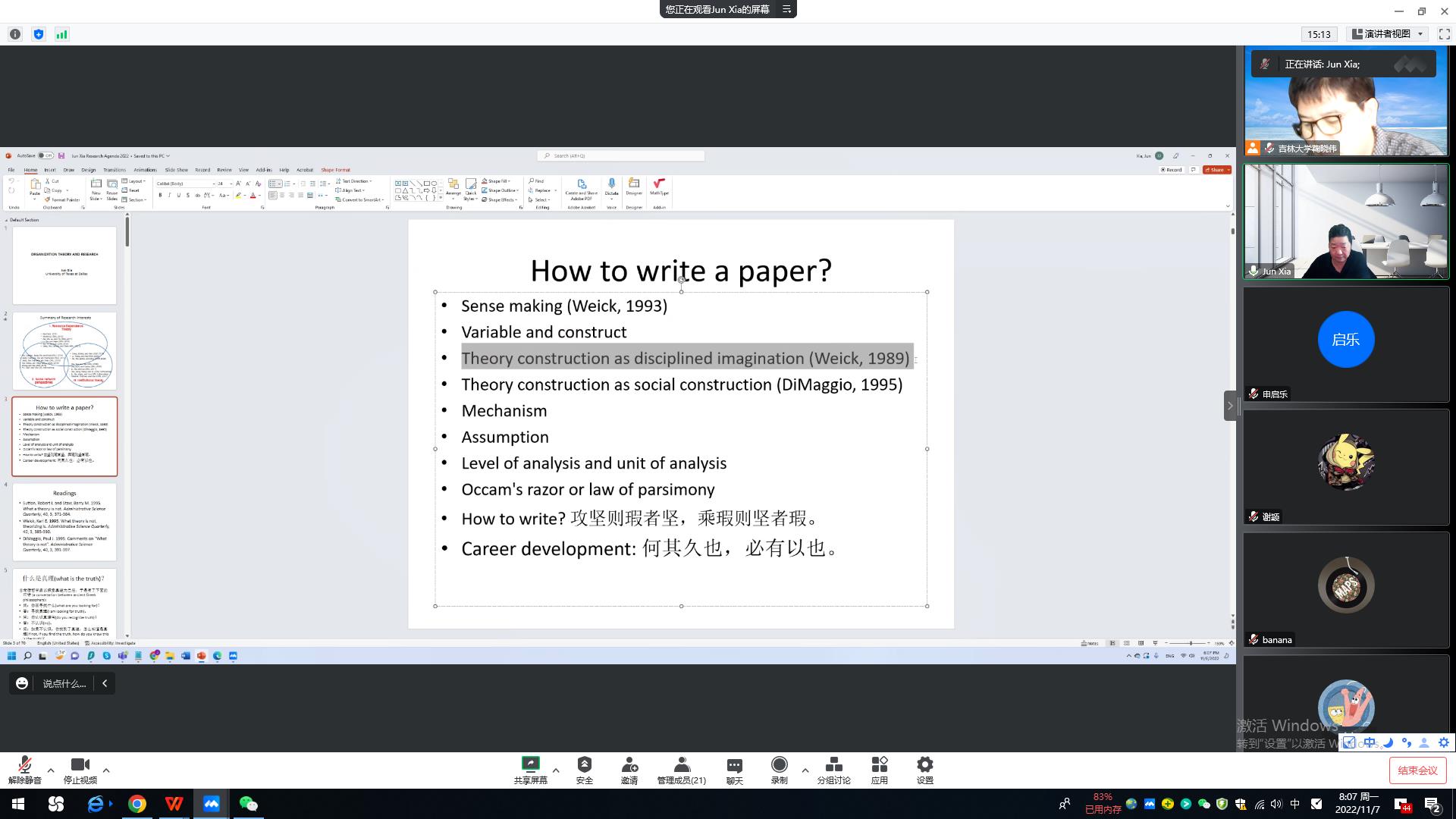 德克萨斯大学达拉斯分校Naveen Jindal商公司夏军教授受市场营销系邀请带来两场学术讲座,讲座由鞠晓伟教授主持。第一场讲座题为“Variable and construct as well as level of analysis and unit of analysis”,讲座围绕“Variable and construct”的主题展开。夏军教师表示,很多人进入一个误区,即认为“变量”与“构念”是一件事情,但实际上并不是。夏军教授通过讲解现象(变量),理论(构念)与情景(数据)之间的关系来进一步说明这个事情。值得注意的是,现象必须要落实到具体的变量上,一个构念可以对应多个变量,而一个变量也可以对应多个构念。因此,变量与构念之间是能相互转换的。比如,变量Size在制度理论中可以转换为构念“visibility”,而在RDT中又可以转换为构念“Power”。只有这样,才能更好的把现象与理论相结合。此外,在某些理论中,如Dependence理论,构念和变量又是一致的,而在制度理论中,比如,合法性的衡量则是不固定的。因此,变量与构念之间的关系又会根据具体文章的情景不同而不同。