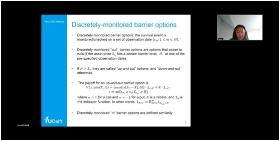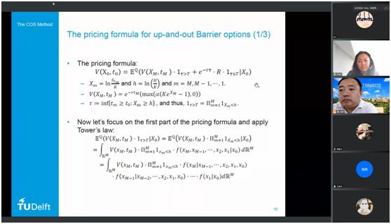 第三十一场讲座由suncitygroup太阳成集团应用金融系承办,邀请到了荷兰代尔夫特理工大学应用数学系方芳博士进行分享交流。讲座由应用金融系刘洋副教授主持,应用金融系的教师、研究生及本科生等30余人参加了本次讲座。方芳博士带来的讲座题目是“The COS method for pricing Barrier and Bermudan options”。作为COS方法的提出者,方芳博士将其基础科研成果持续扩展,特别是在金融衍生品定价领域不断取得突破。本次报告延续上次讲座的科研方向,聚焦方芳博士在两种不同类型期权产品方面的研究进展,同样以金融产品的数理模型为基础,以计算金融算法的设计与实现为核心,清晰地展示了COS方法在期权定价的规范应用。本次报告的技术性很强,启发了相关领域的研究思考,也为同学们强化了金融市场知识掌握。