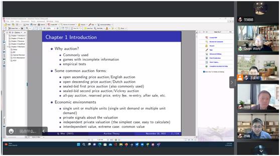 华盛顿大学经济系教授温泉应数量经济系邀请,为公司师生带来两场学术盛宴。讲座由数量经济系孙巍教授主持,数量经济系部分教师、研究生和本科生参与了学术活动。第一场讲座题目为“Auction theory”,围绕“The results of classical auction theory”的主题,温泉教授首先介绍了“Auction theory”的基本内容,从 “Why auction”、“Some common auction forms”和“Economic environments”三个方面展开。此外,温泉教授详细介绍了常见的拍卖模型“Private value auctions”,从模型的基本假设入手,介绍了模型的设定、具体形式并展示了最后结果。第二场讲座是第一场讲座内容的实证应用,围绕温泉教授发表的文章展开。这篇文章以我国各大城市车牌分配限制方式不同为背景,对广州汽车牌照hybrid分配方式进行分析,基于现实数据进行模型设定和均衡分析,探讨“auction-lottery hybrid mechanism”是否可以兼顾效率和公平。两场讲座中,温泉教授详尽讲述了理论知识和实践应用两部分,极大的激发了大家钻研理论并付诸实践应用的科研热情。讲座过程中,温泉教授与公司师生进行了深入的讨论和交流,为师生们提供了更广阔的科研思路和有益的学术指导。