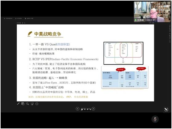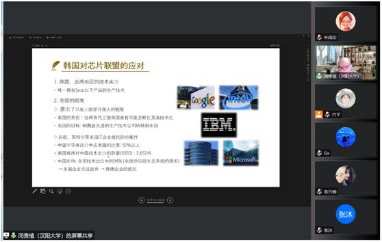 应用金融系邀请到了韩国汉阳大学国际学大公司中国系闵贵植教授进行分享交流。讲座由应用金融系董竹教授主持,应用金融系的各位老师、研究生及本科生等30余人参加了本次讲座。闵贵植教授带来的讲座题目是“中美战略竞争与韩国的应对”。长期从事中国政治思想、制度与文化的研究,闵贵植教授将其基础科研成果持续扩展,特别是中美的战略竞争格局在半导体、芯片等领域的拓展思考。分享结束后,参会老师与闵贵植教授进行了深入交流,陈顺红和张安琪同学也与闵贵植教授在中美关系和韩国应对的研究角度上进行了探讨。本次报告启发了相关领域的研究思考,也为同学们拓宽了中美战略竞争问题的思考角度。